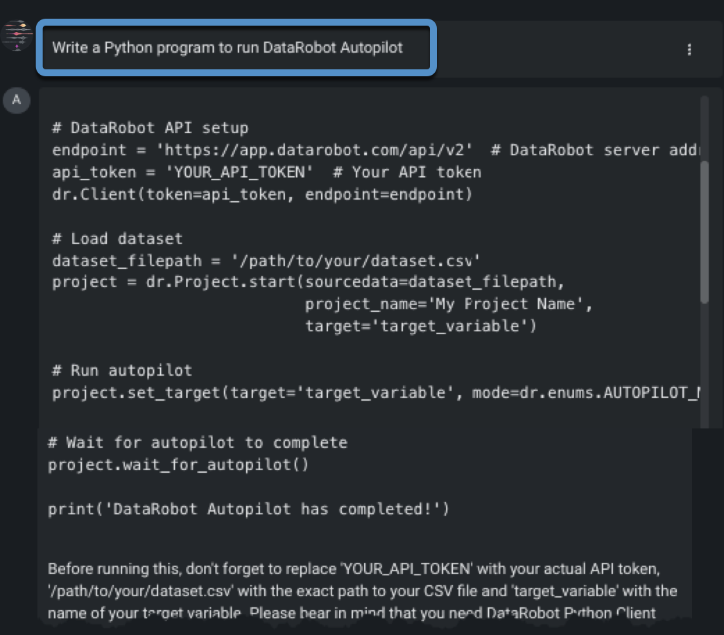 Chatting within the playground is a "conversation"—you can ask follow-up questions with subsequent prompts. Following is an example of asking the LLM to provide Python code for running DataRobot Autopilot: