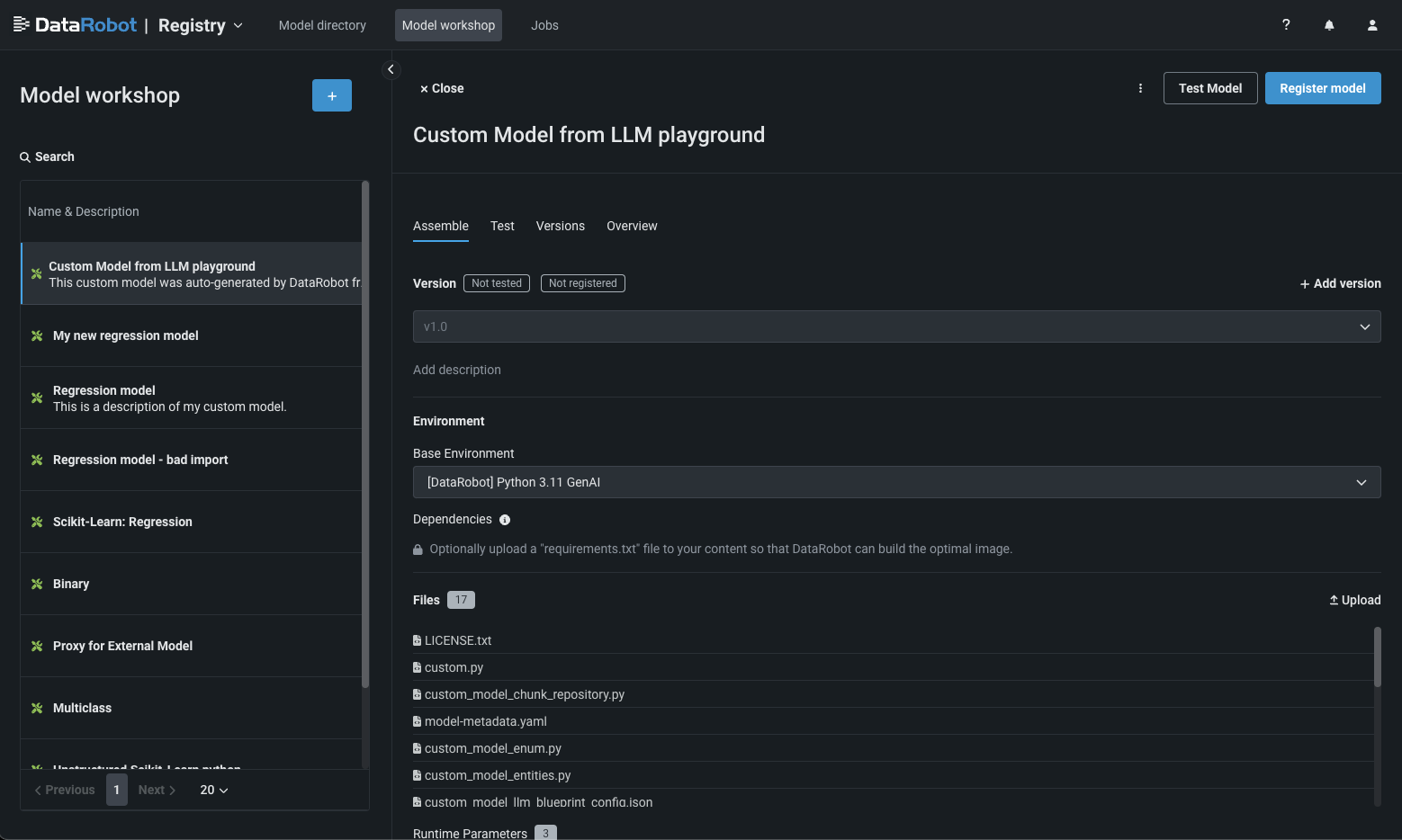 After you complete the custom model assembly configuration, you can test the model or create new versions. DataRobot recommends testing custom LLMs before deployment.