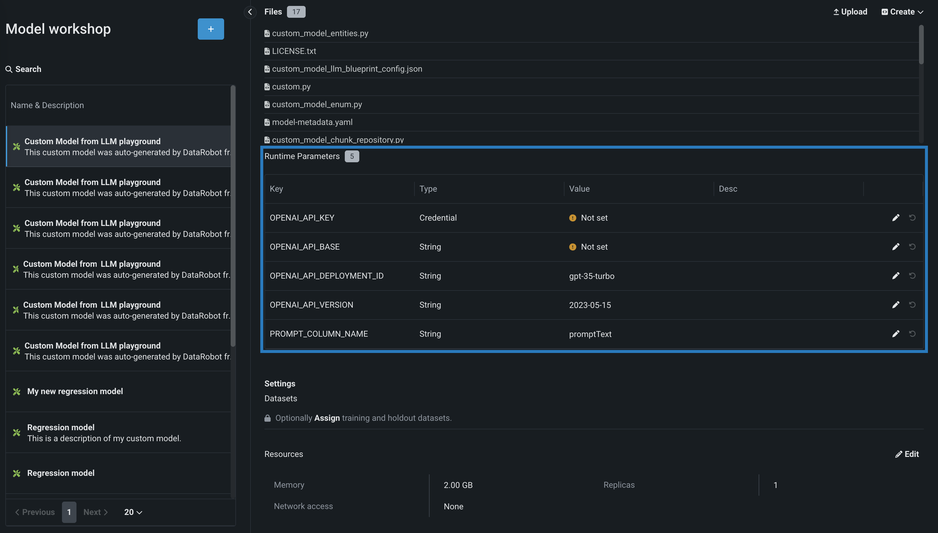 Key Description OPENAI_API_KEY Select the API Token credential, created on the Credentials Management page, for the Azure OpenAI LLM API endpoint. OPENAI_API_BASE Enter the URL for the Azure OpenAI LLM API endpoint. OPENAI_API_DEPLOYMENT_ID Enter the name of the Azure OpenAI deployment of the LLM, chosen when deploying the LLM to your Azure environment. For more information, see the Azure OpenAI documentation on how to Deploy a model. The default deployment name suggested by DataRobot matches the ID of the LLM in Azure OpenAI (for example, gpt-35-turbo). Modify this parameter if your Azure OpenAI deployment is named differently. OPENAI_API_VERSION Enter the Azure OpenAI API version to use for this operation, following the YYYY-MM-DD or YYYY-MM-DD-preview format (for example, 2023-05-15). For more information on the supported versions, see the Azure OpenAI API reference documentation. PROMPT_COLUMN_NAME Enter the prompt column name from the input .csv file. The default column name is promptText. Amazon-hosted LLM: Amazon Titan, Anthropic Claude 2.1, Anthropic Claude 3 (Haiku, Opus, and Sonnet), Anthropic Claude 3.5 Sonnet (v1 and v2), and Amazon Nova (Micro, Lite, and Pro)