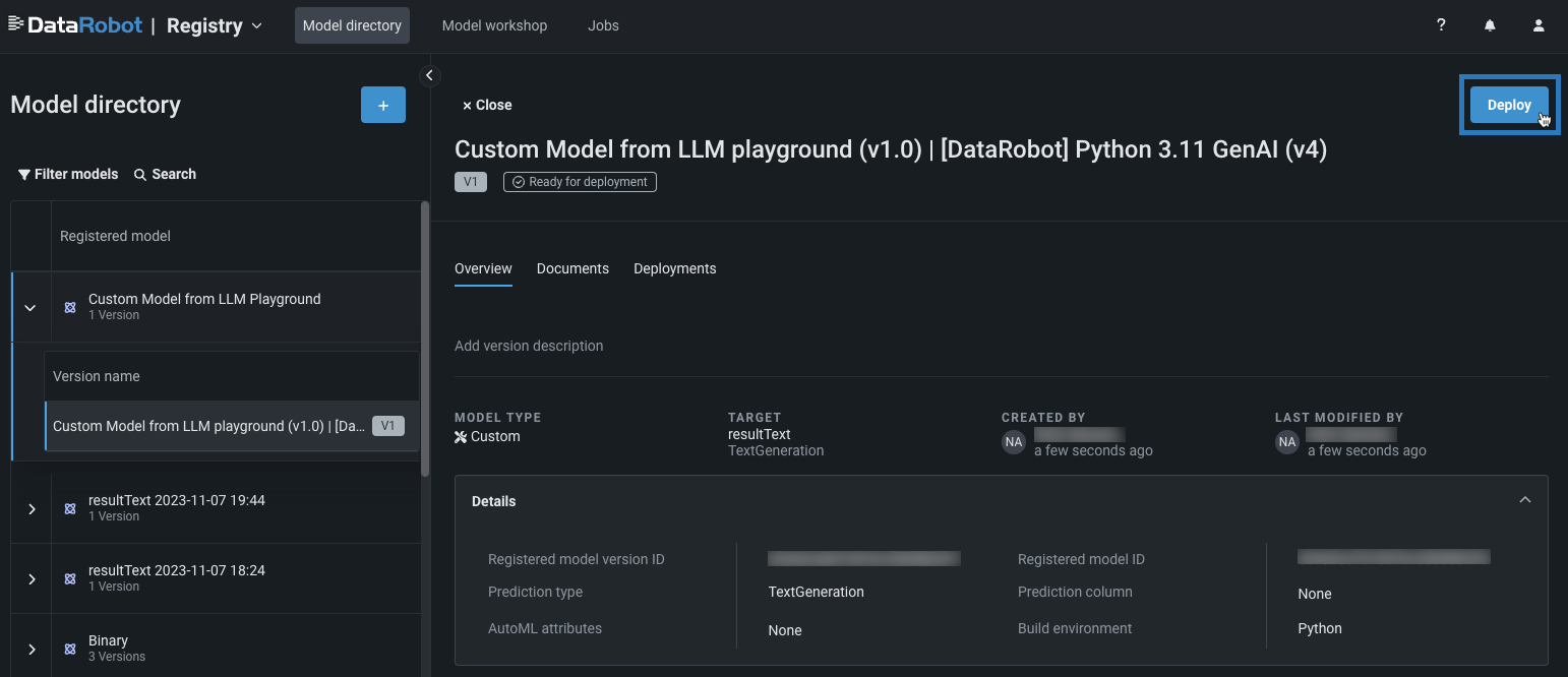 From the Models tab, in the upper-right corner of the registered model version panel, click Deploy and configure the deployment settings.