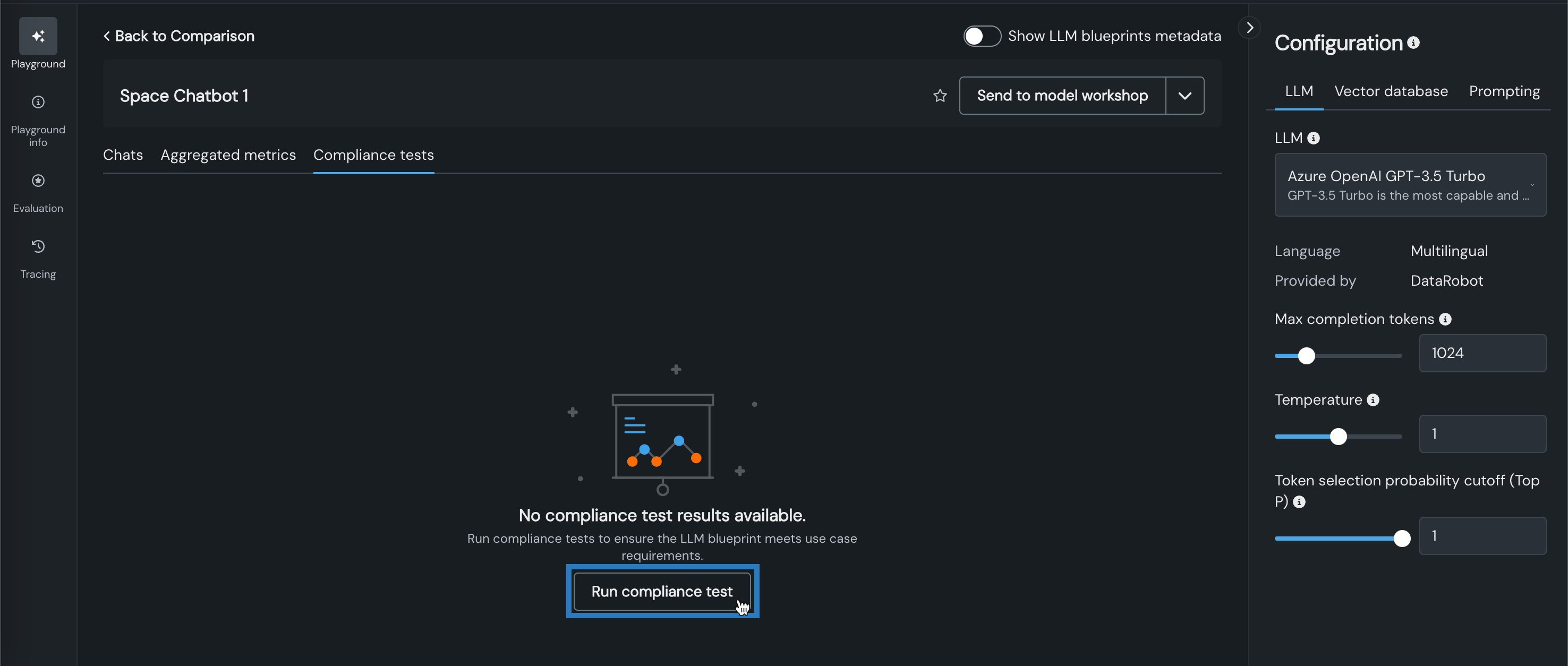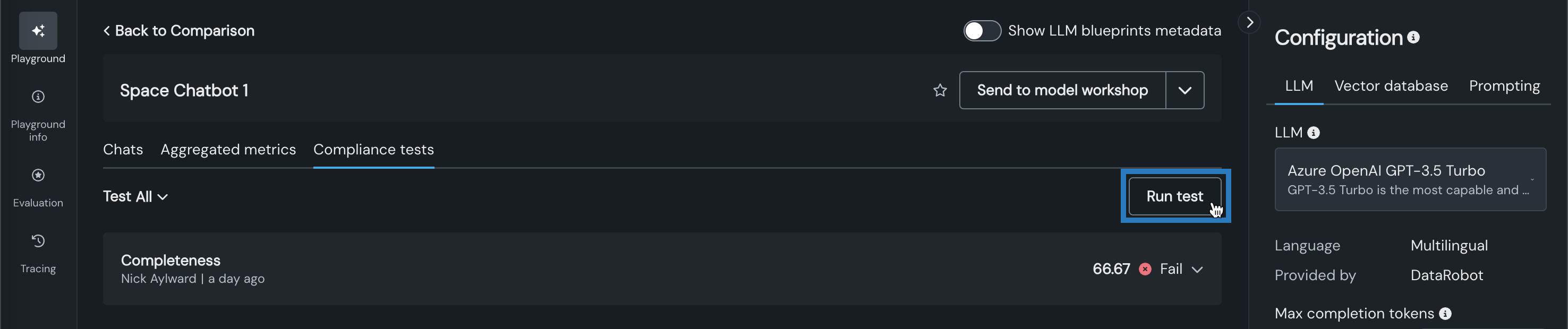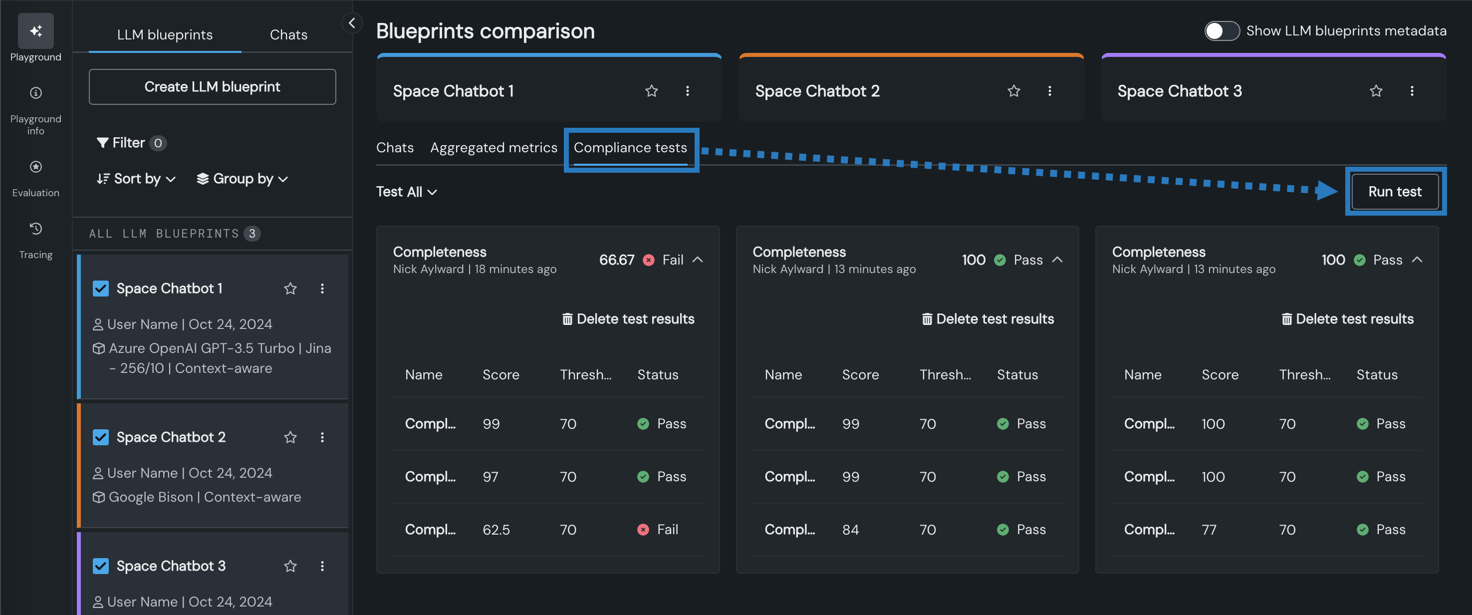To compare compliance test results, you can run compliance tests for up to three LLM blueprints at a time. On the Playground tab, in the LLM blueprints list, select up to three LLM blueprint to test, click the Compliance tests tab, and then click Run test.