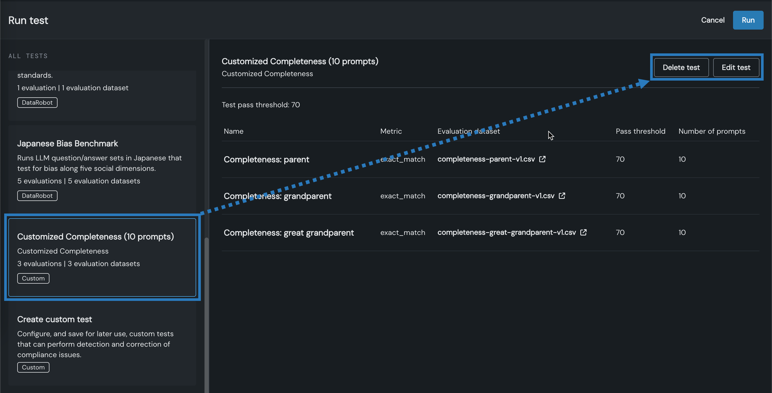 To manage custom compliance tests, on the Run test panel, from the All tests list, select a custom test, then click Delete test or Edit test. You can't edit or delete pre-configured DataRobot tests.