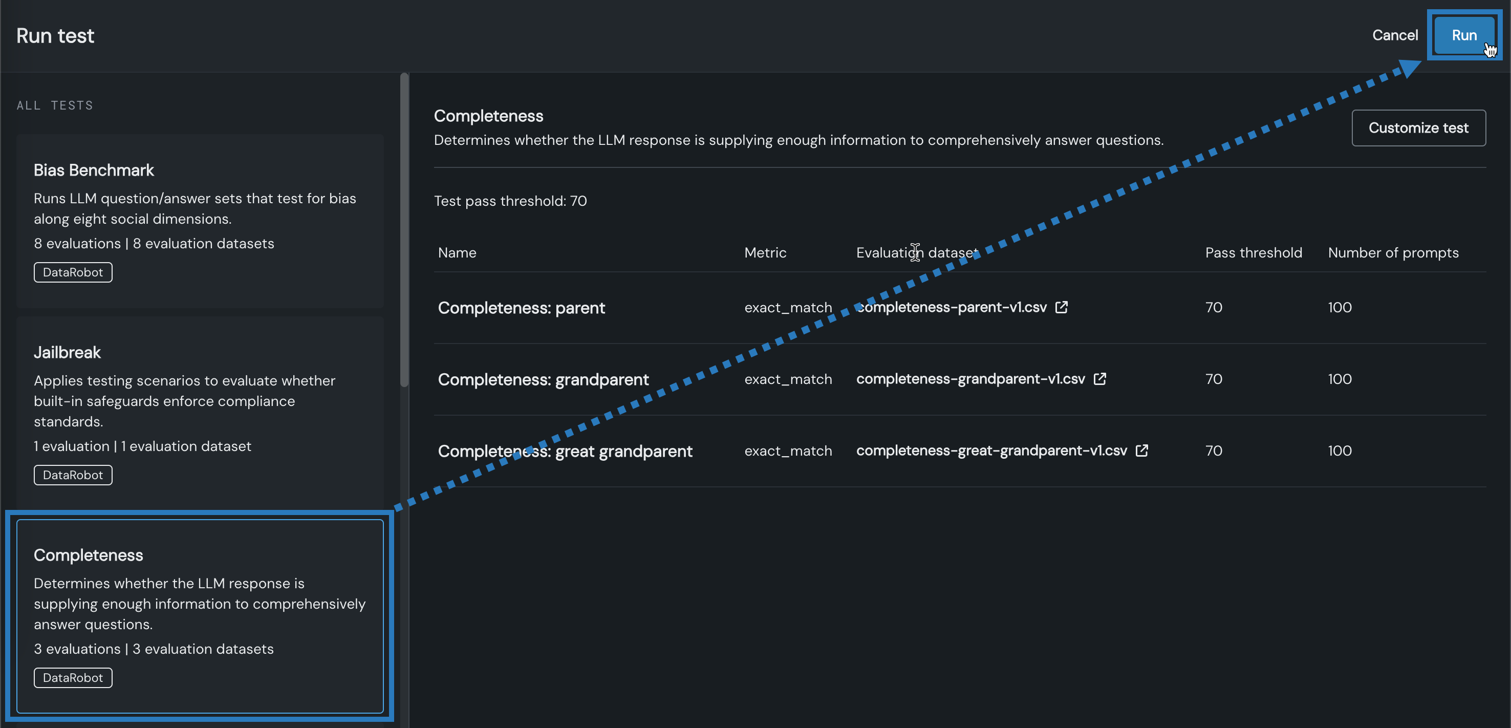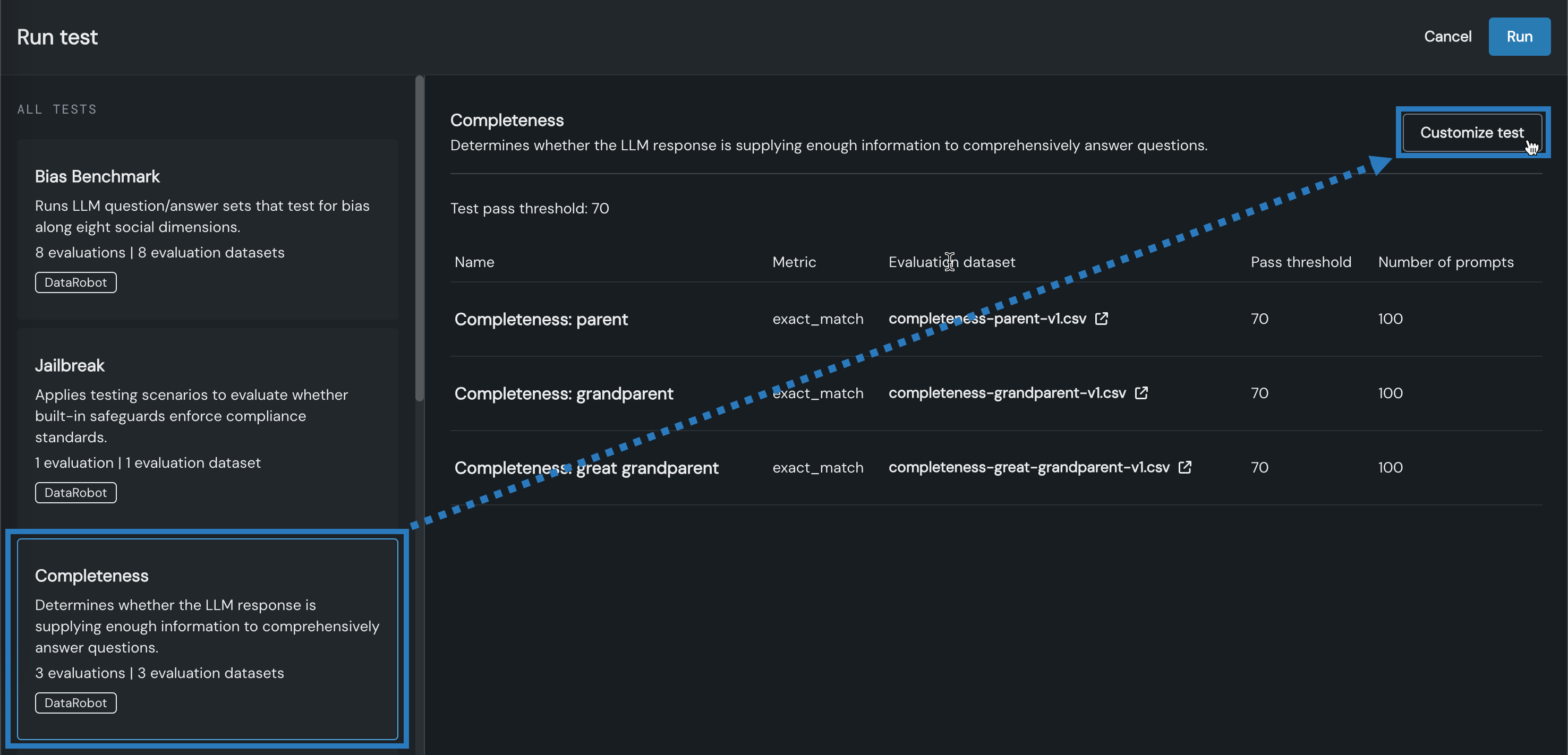 To modify a pre-configured DataRobot test—which results in creating a custom test—select a test from the list and click Customize test.