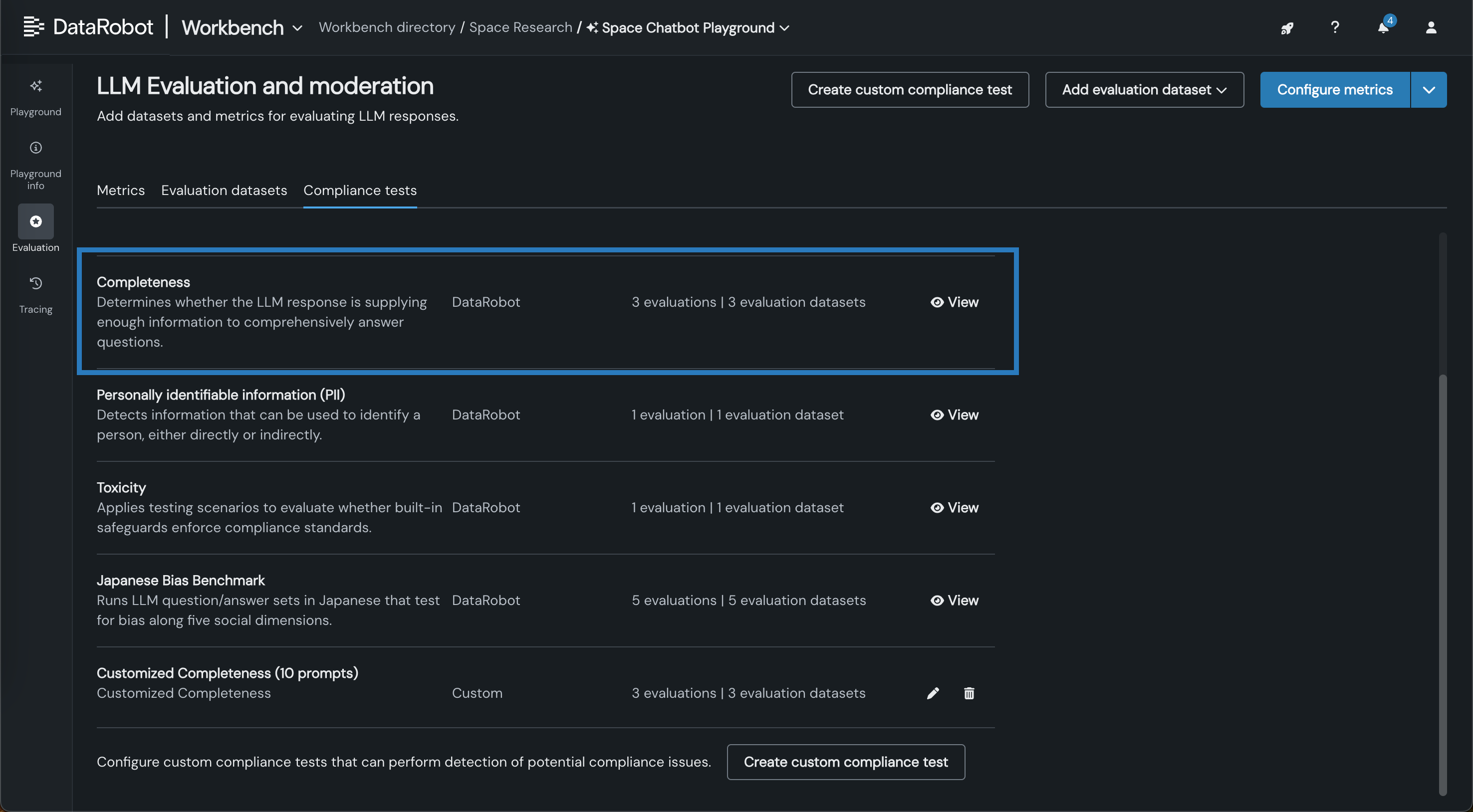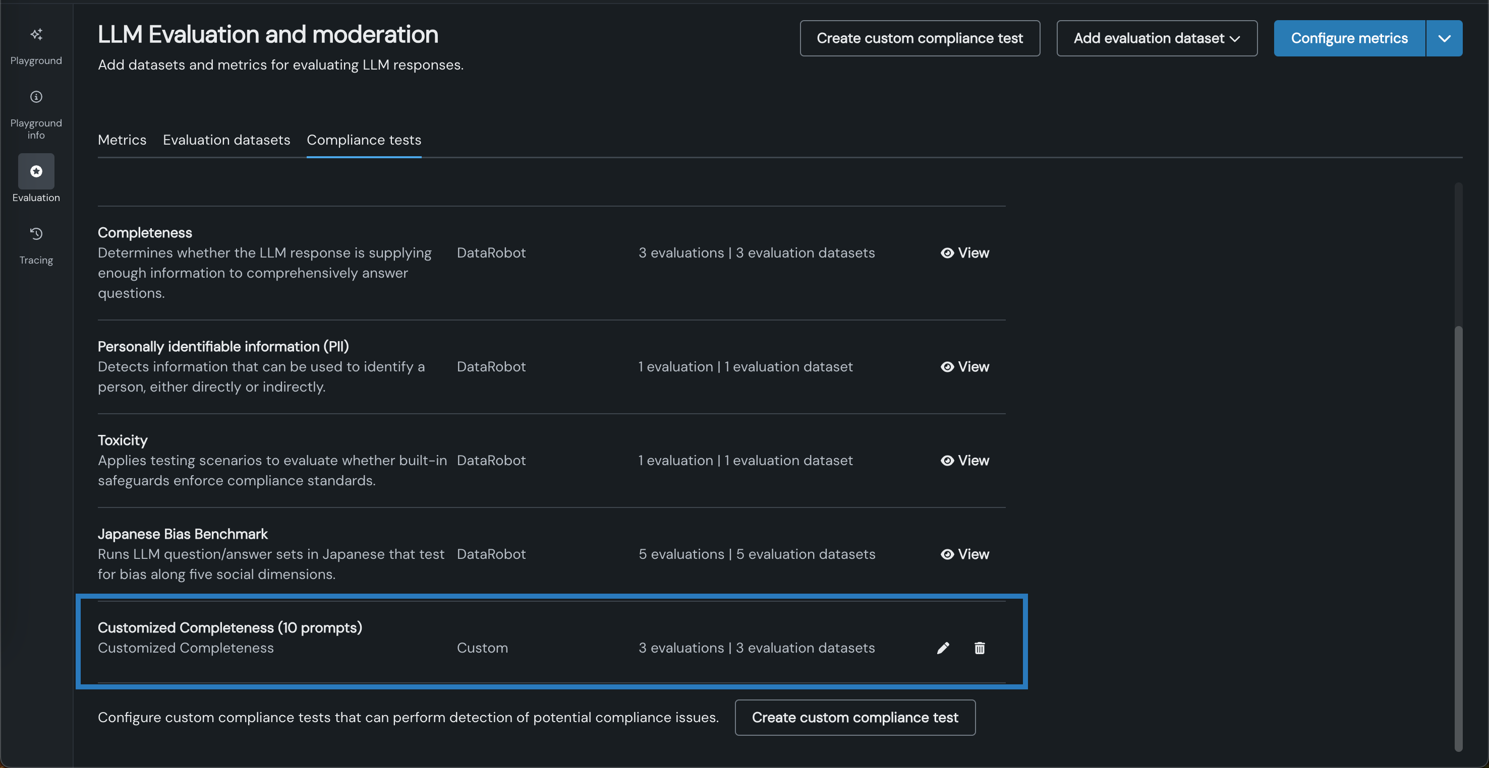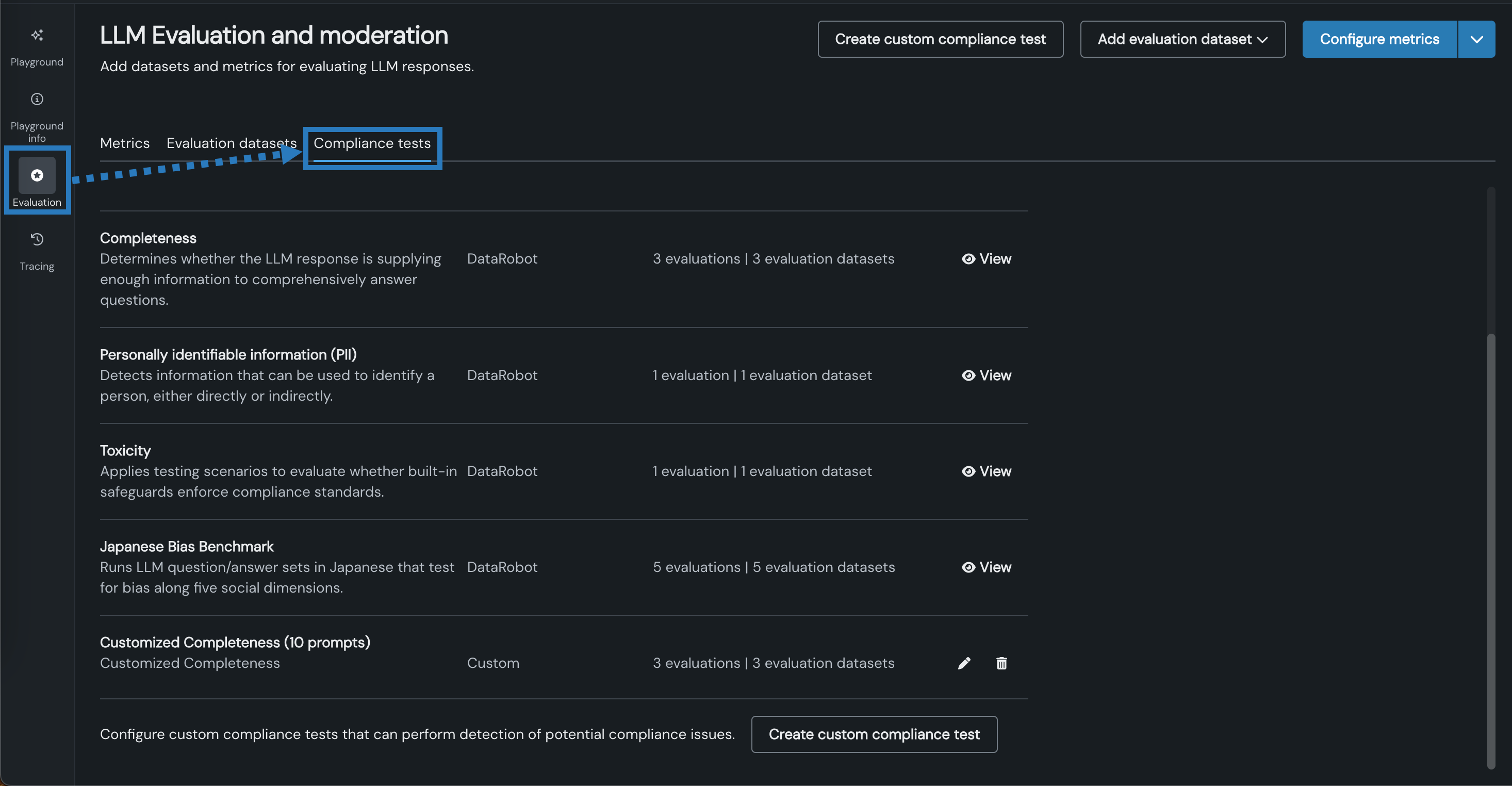 | Compliance tests | Combine an evaluation metric and dataset to automate the detection of compliance issues with pre-configured or custom compliance testing. |