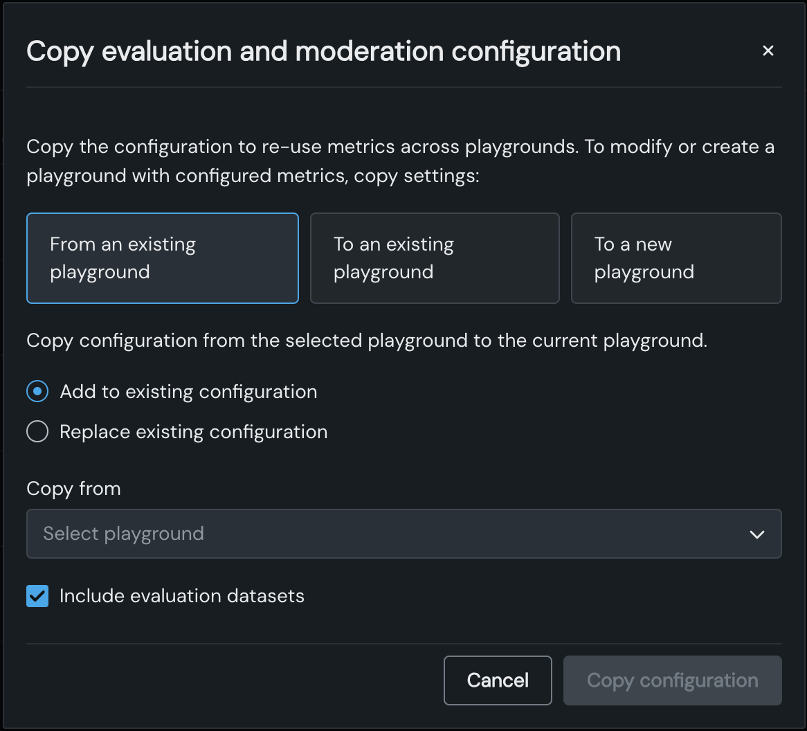 If you select To an existing playground, choose to Add to existing configuration or Replace existing configuration and then select a playground to Copy to.