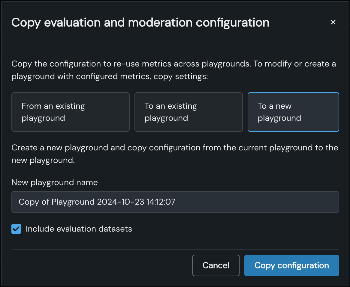 Select if you want to Include evaluation datasets, and then click Copy configuration.