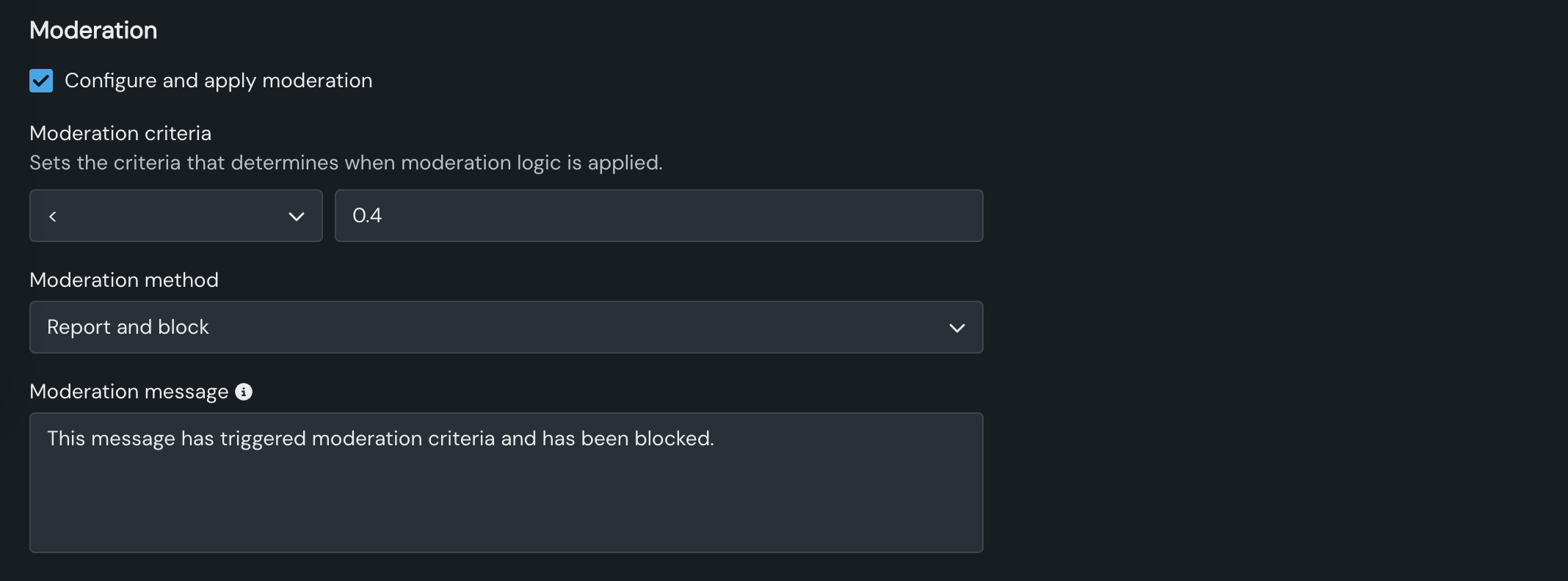 Setting Description Moderation criteria If applicable, set the threshold settings evaluated to trigger moderation logic. For the Emotions Classifier, select Matches or Does not match and define a list of classes (emotions) to trigger moderation logic. Moderation method Select Report or Report and block. Moderation message If you select Report and block, you can optionally modify the default message. -