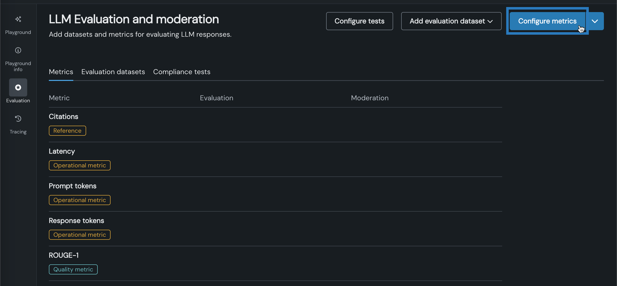 In the upper-right corner of the LLM Evaluation and moderation page, click Configure metrics: