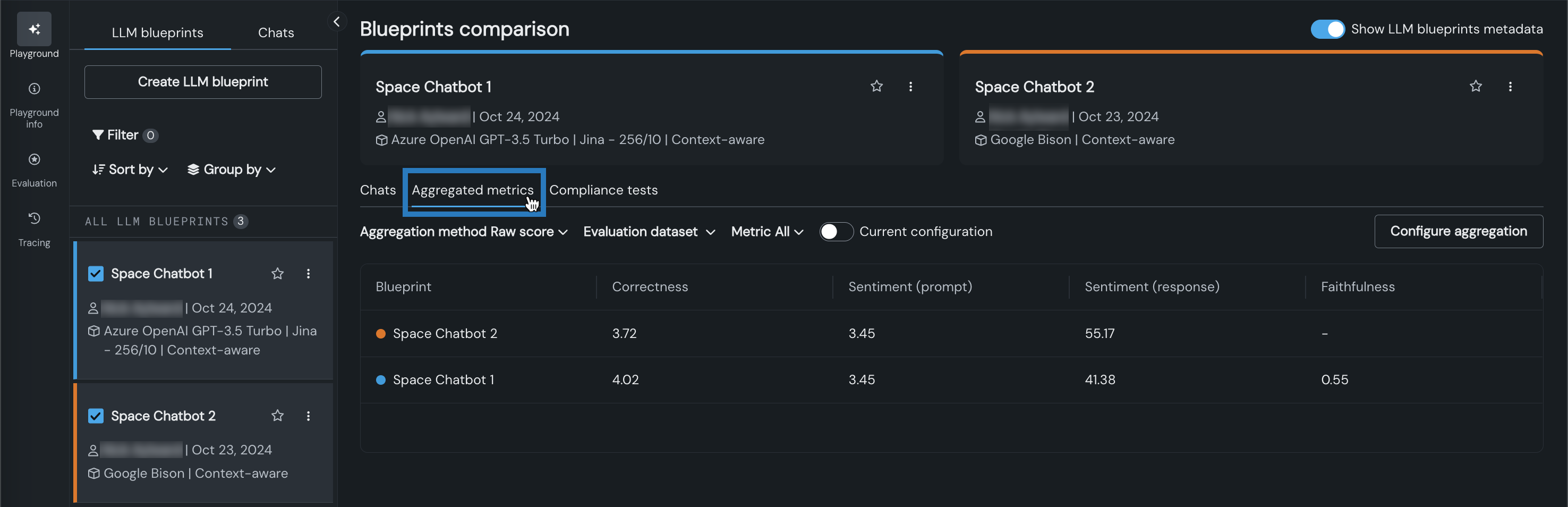 Returning to the LLM Blueprints comparison page, you can now open the Aggregated metrics tab to view a leaderboard comparing LLM blueprint performance for the generated aggregated metrics: