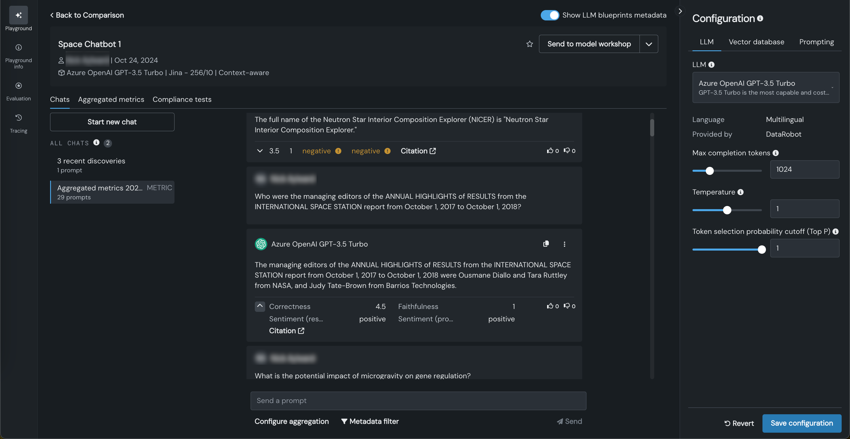| Aggregated metrics | Combine evaluation metrics across many prompts and responses to evaluate an LLM blueprint at a high level, as only so much can be learned from evaluating a single prompt or response. |