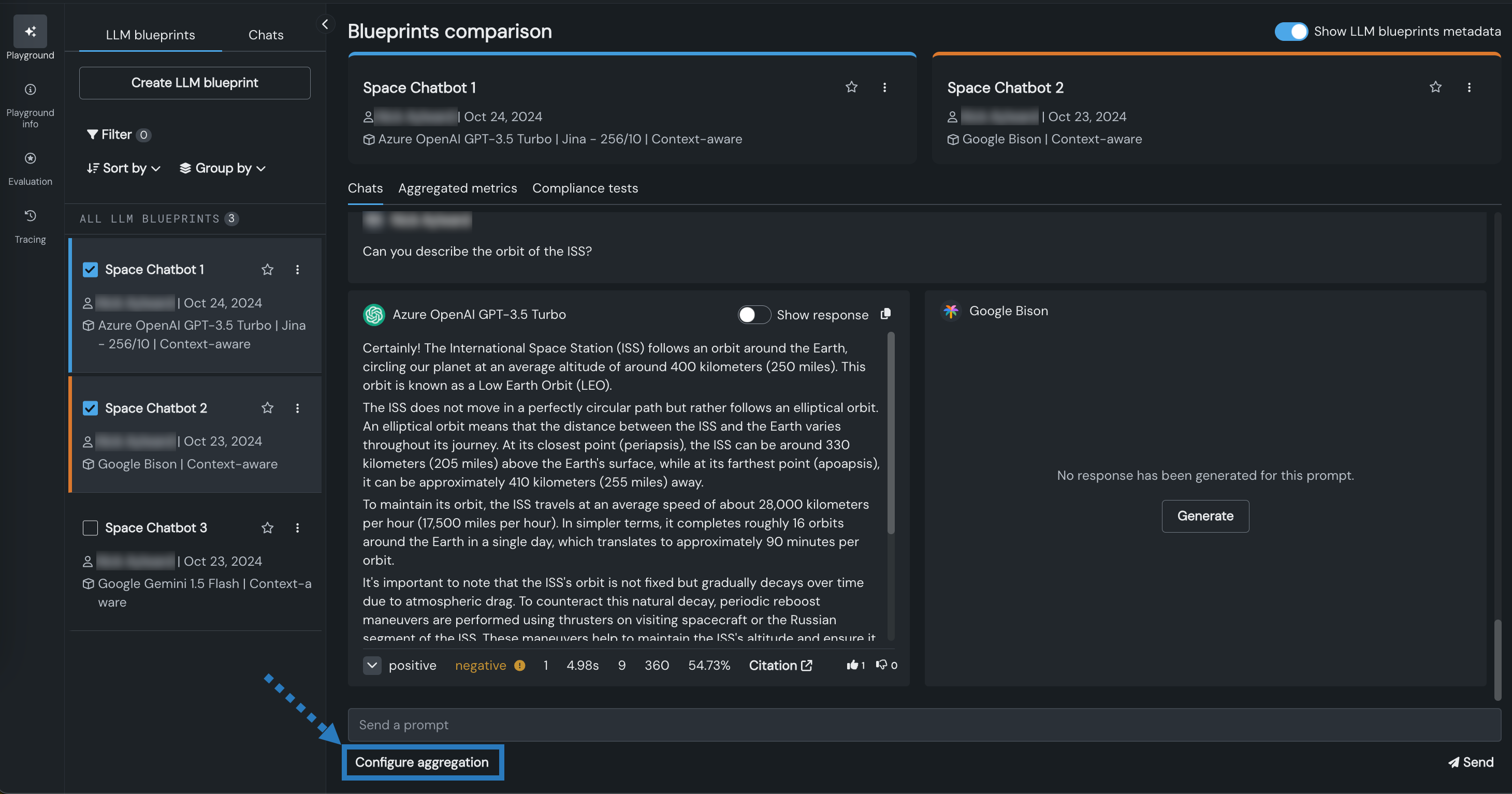 On the Playground tab, in the LLM blueprints list, click the LLM blueprint you want to test, or, select up to three blueprints for comparison.