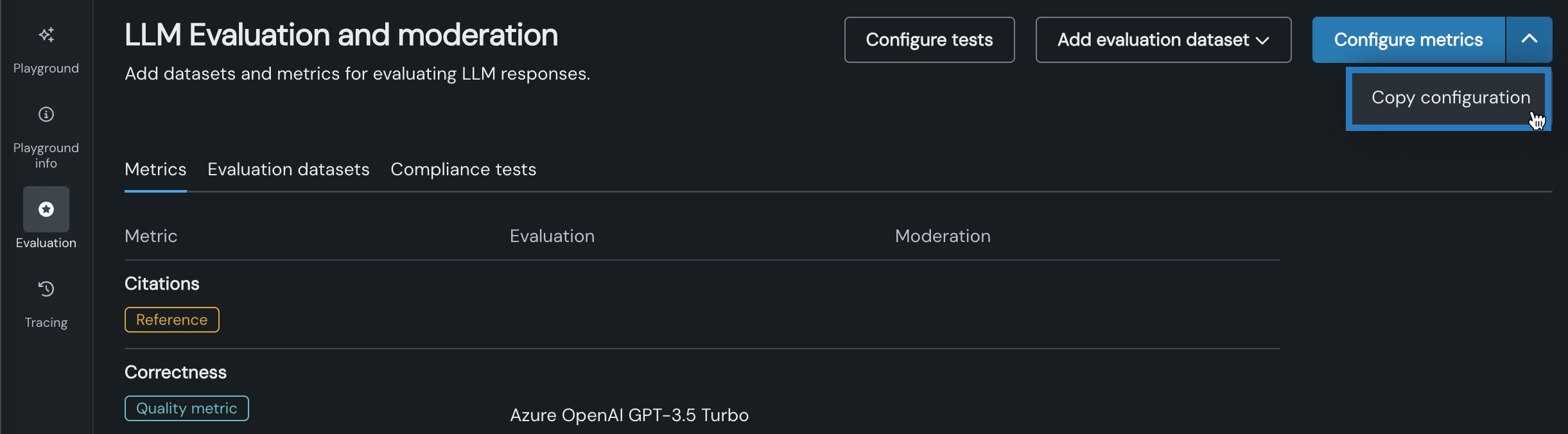 In the upper-right corner of the LLM Evaluation and moderation page, next to Configure metrics, click , and then click Copy configuration.