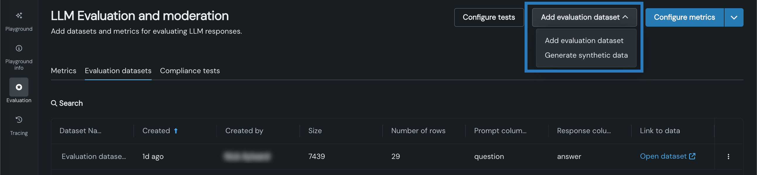 On the LLM Evaluation and moderation tab, click the Evaluation datasets tab to view any existing datasets, then, click Add evaluation dataset, and select one of the following methods: