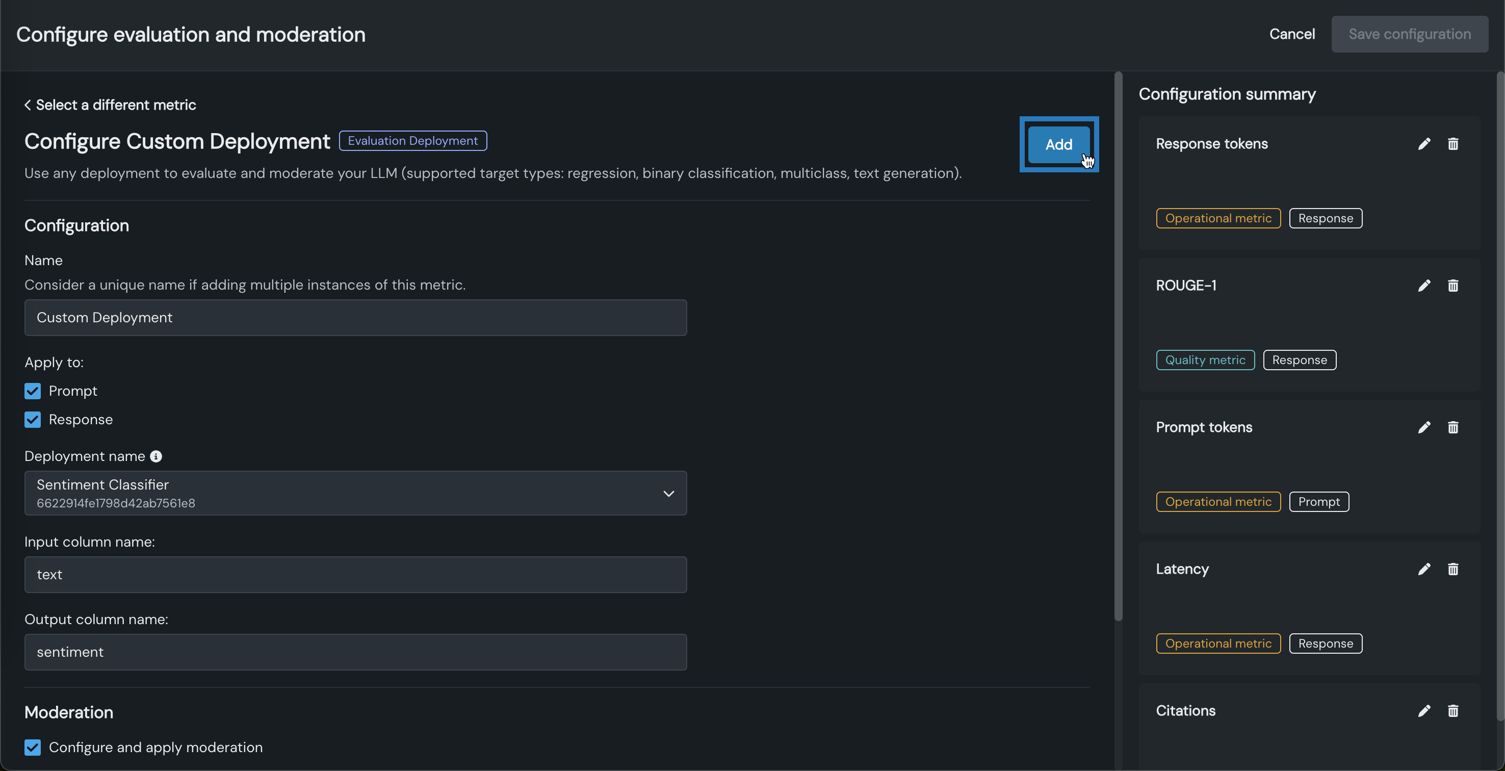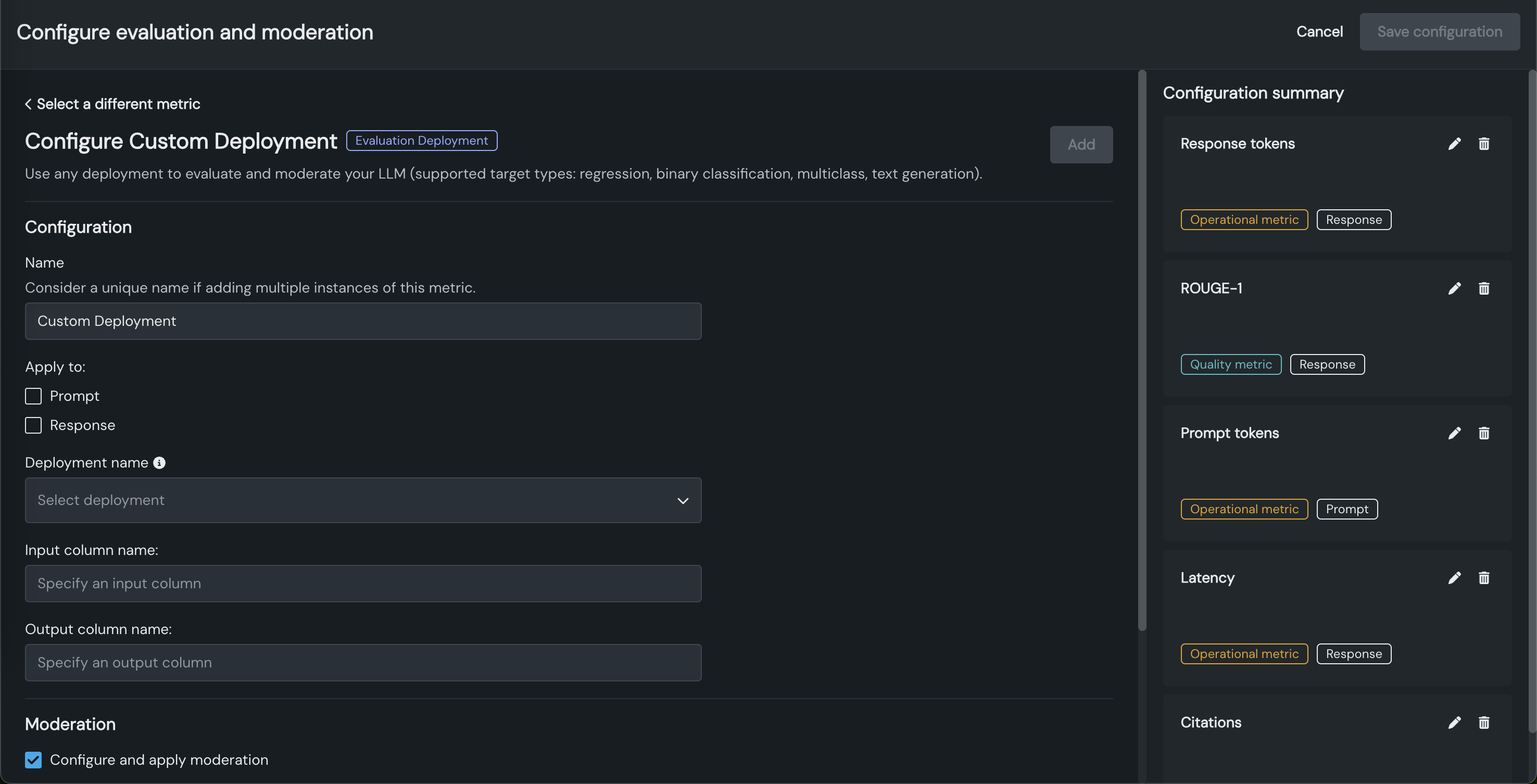 The metrics you selected appear on the Configure evaluation and moderation panel, in the Configuration summary sidebar.