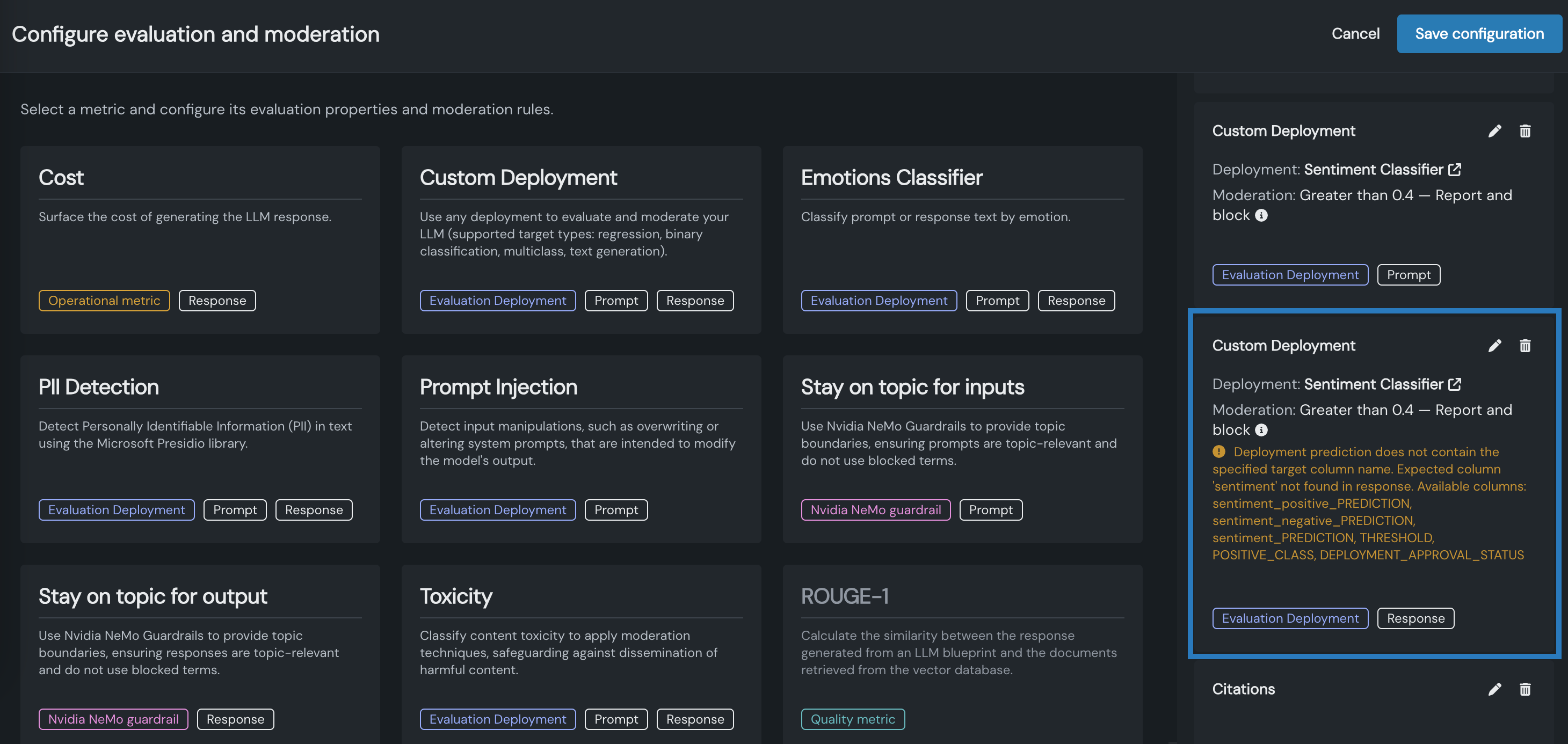 Evaluation metric Requires Description Cost LLM cost settings Calculates the cost of generating the LLM response using a default or custom LLM, currency, input cost-per-token, and output cost-per-token values. The cost calculation also includes the cost of citations. Custom Deployment Custom deployment Uses an existing deployment to evaluate and moderate your LLM (supported target types: regression, binary classification, multiclass, text generation). Emotions Classifier Emotions Classifier deployment Classify prompt or response text by emotion. PII Detection Presidio PII Detection deployment Detects Personally Identifiable Information (PII) in text using the Microsoft Presidio library. Prompt Injection Prompt Injection Classifier deployment Detects input manipulations, such as overwriting or altering system prompts, intended to modify the model's output. Stay on topic for inputs NVIDIA NeMo guardrails configuration Uses NVIDIA NeMo Guardrails to provide topic boundaries, ensuring prompts are topic-relevant and do not use blocked terms. Stay on topic for output NVIDIA NeMo guardrails configuration Use NVIDIA NeMo Guardrails to provide topic boundaries, ensuring responses are topic-relevant and do not use blocked terms. Toxicity Toxicity Classifier deployment Classifies content toxicity to apply moderation techniques, safeguarding against dissemination of harmful content. ROUGE-1 Vector database Recall-Oriented Understudy for Gisting Evaluation calculates the similarity between the response generated from an LLM blueprint and the documents retrieved from the vector database. Citations Vector database Reports the documents retrieved by an LLM when prompting a vector database. All tokens N/A Tracks the number of tokens associated with the input to the LLM, output from the LLM, and/or retrieved text from the vector database. Prompt tokens N/A Tracks the number of tokens associated with the input to the LLM. Response tokens N/A Tracks the number of tokens associated with the output from the LLM. Document tokens N/A Tracks the number of tokens associated with the retrieved text from the vector database. Latency N/A Reports the response latency of the LLM blueprint. Correctness Playground LLM, evaluation dataset, vector database Uses either a provided or synthetically generated set of prompts or prompt and response pairs to evaluate aggregated metrics against the provided reference dataset. The Correctness metric uses the LlamaIndex Correctness Evaluator. Faithfulness Playground LLM, vector database Measures if the LLM response matches the source to identify possible hallucinations. The Faithfulness metric uses the LlamaIndex Faithfulness Evaluator. Multiclass custom deployment metric limits