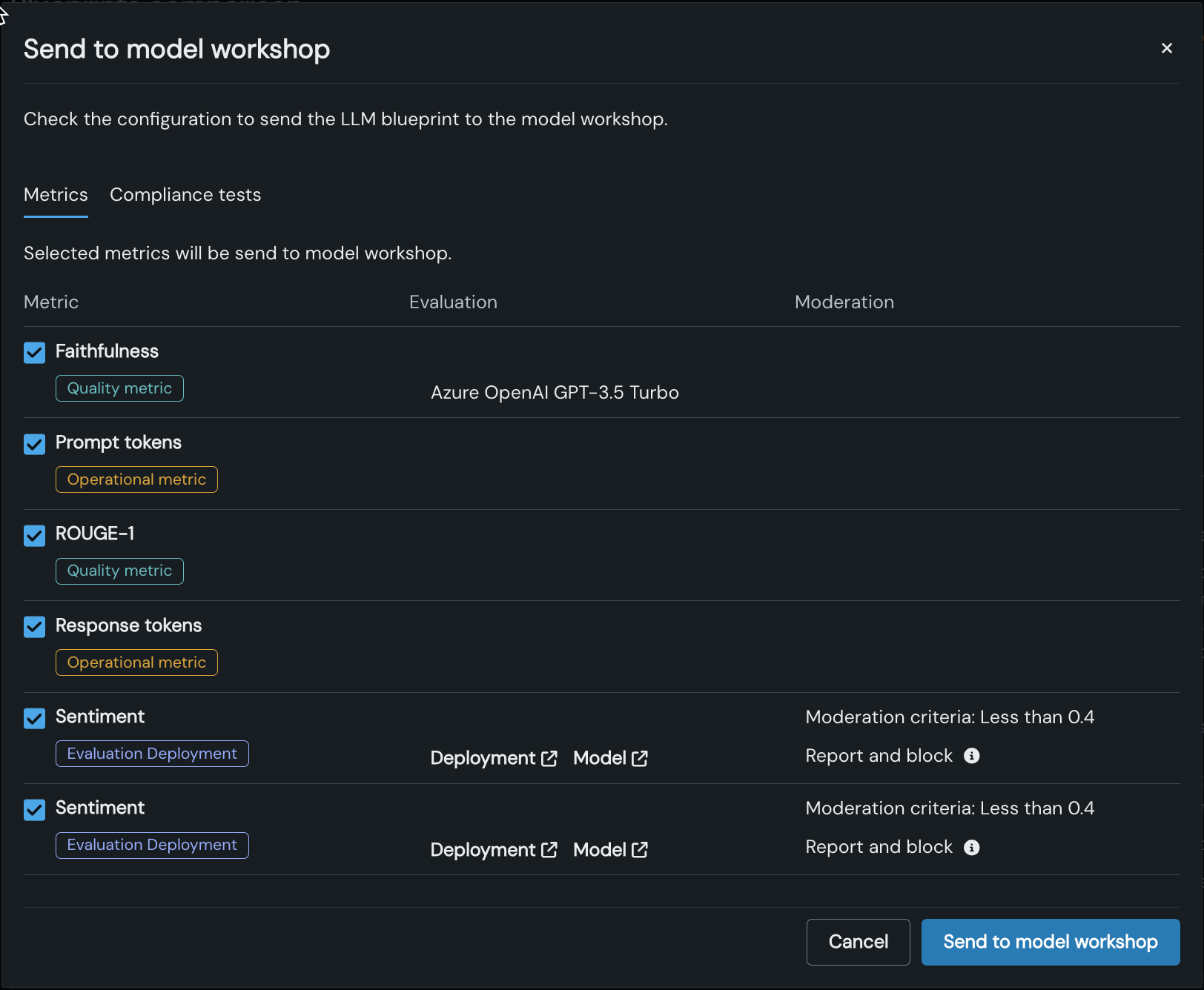 In the Send to model workshop modal, select up to twelve evaluation metrics (and any configured moderations).