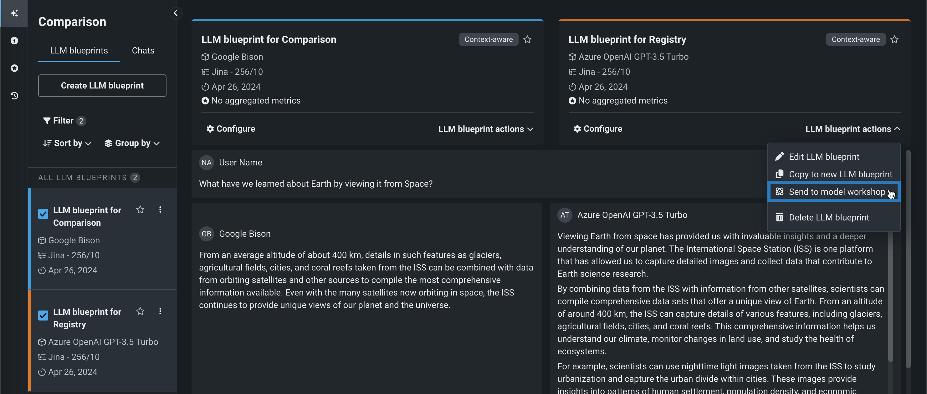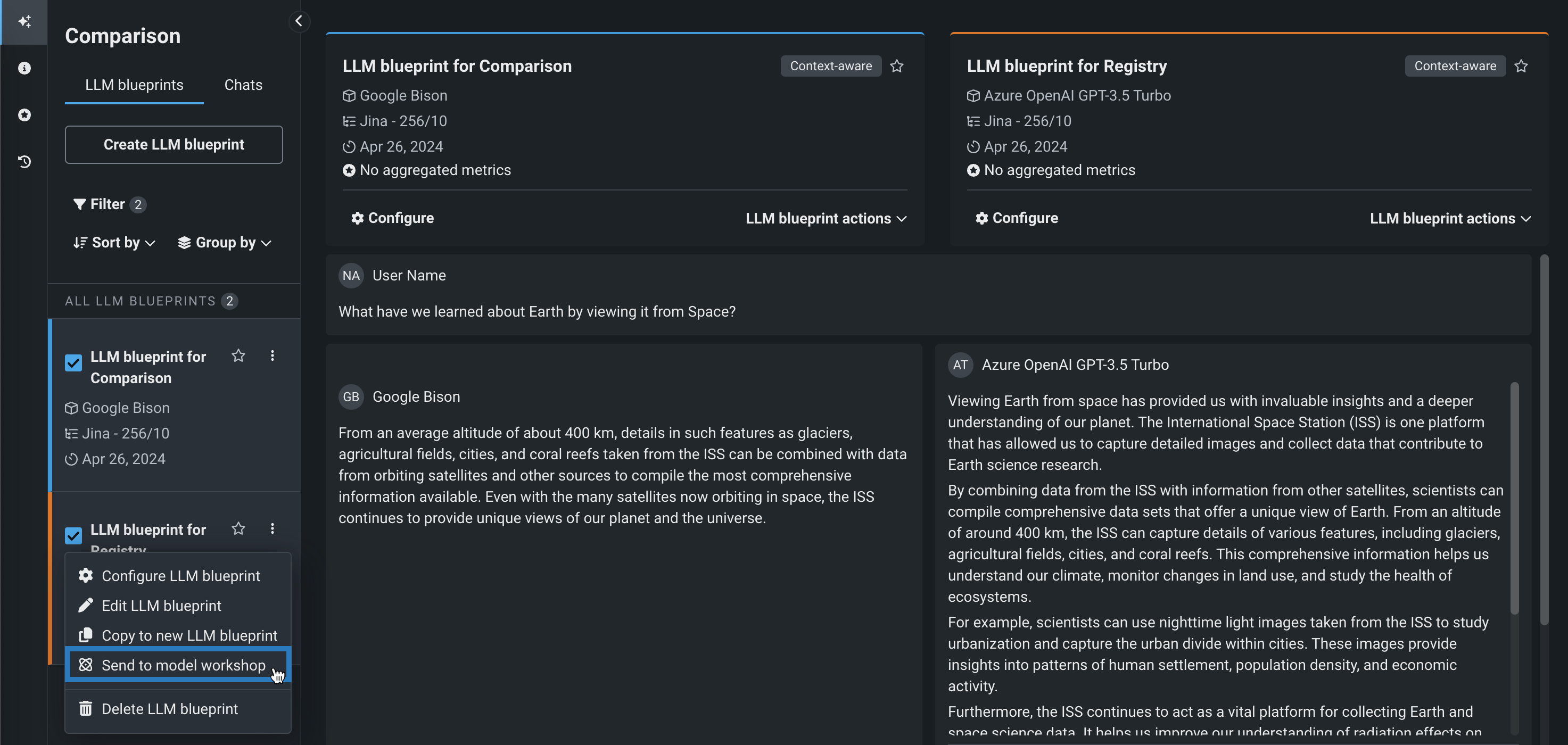 In the Comparison panel, on the LLM blueprints tab, click the Actions menu , and then click Send to model workshop.