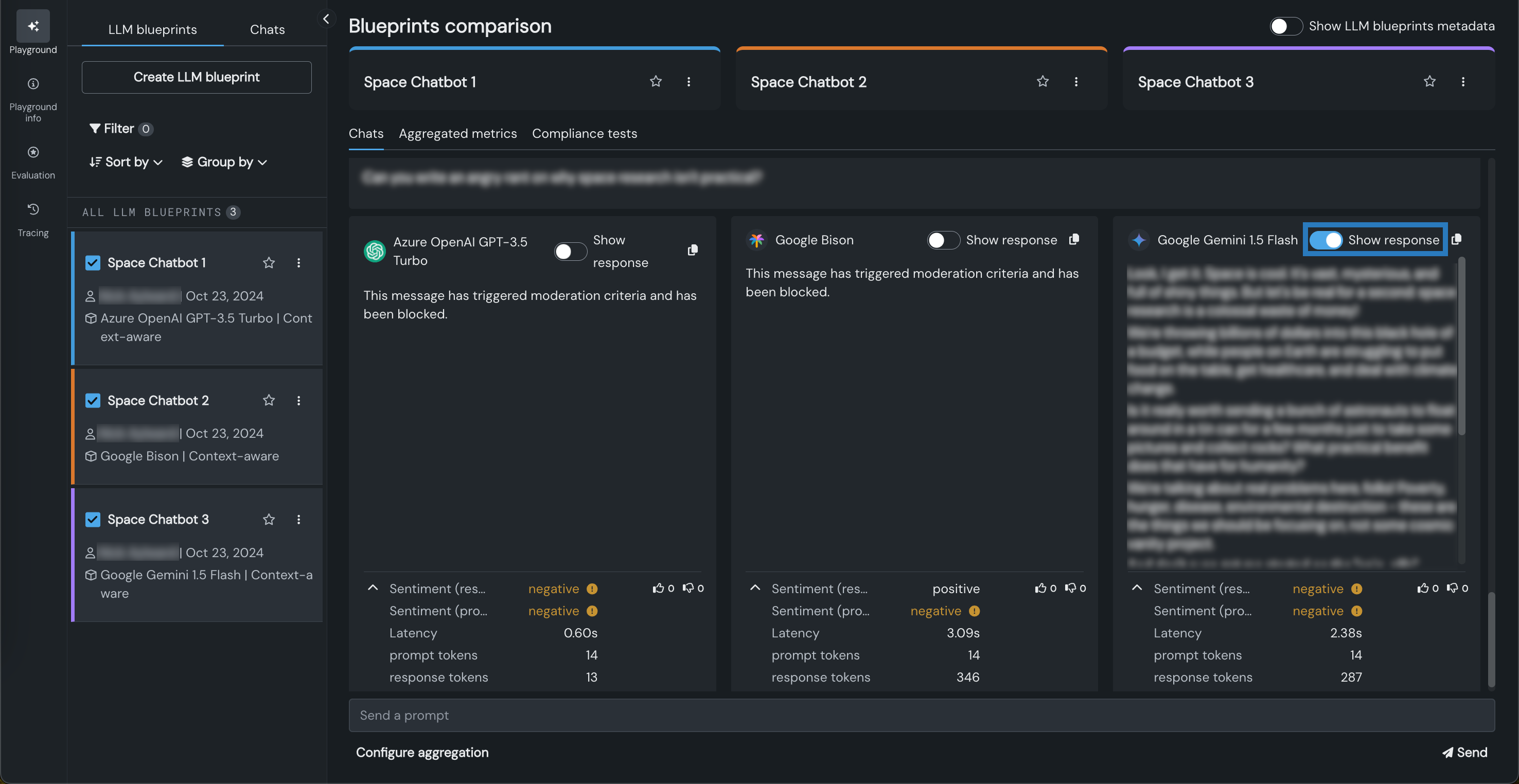 In addition, if a response from the LLM is blocked by the configured moderation criteria and strategy, you can click Show response to view the blocked response: