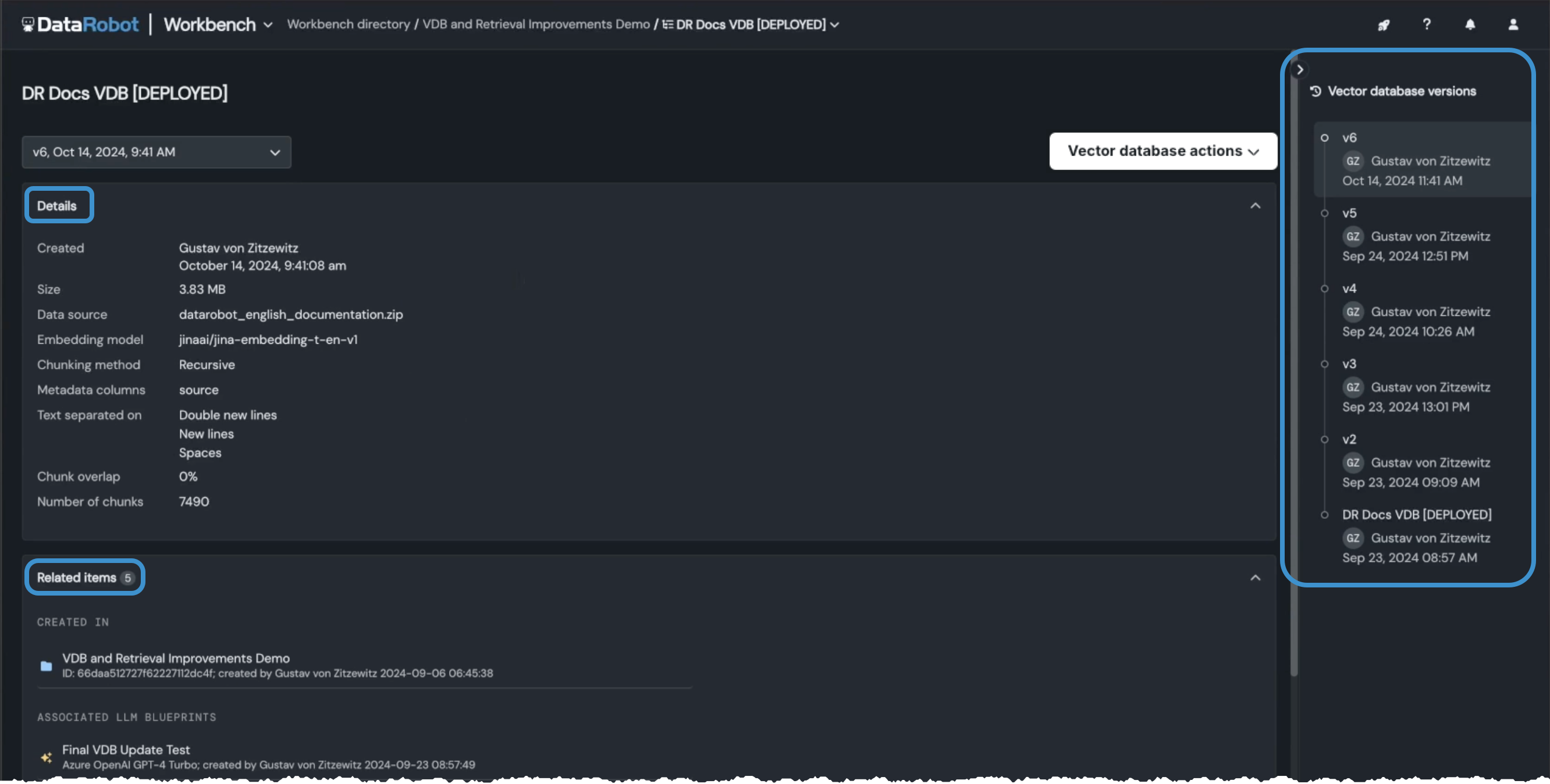 Versions related to a single parent vector database are displayed in a collapsible right panel. Click any version to update the details and related items to reflect information for the selected version.