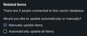 The help text under Related items indicates the number of assets related to source vector database that you are creating a new version from ("There are 3 assets connected to this vector database.") Use the radio buttons to set the update method for all assets connected to the source of the new version, either manually or automatically.