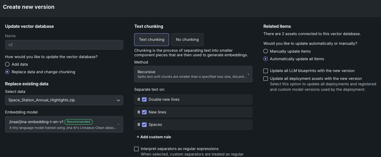 | Update vector database version | Select the data and chunking settings for the new child version. |