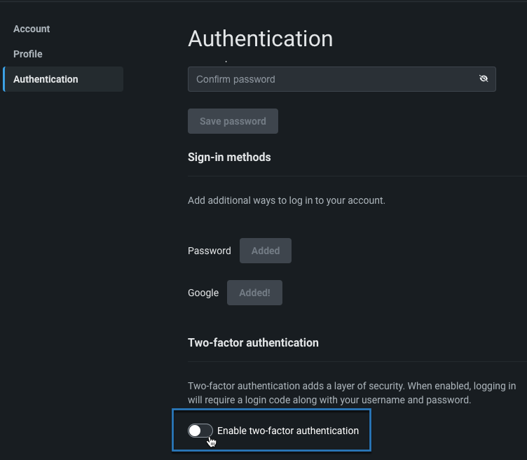 Click the Authentication tab from the User Settings page and switch the Two-Factor Authentication toggle to on: