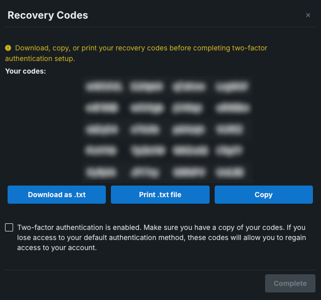 Before completing two-factor authentication, download, copy, or print these codes and save them to a secure location.