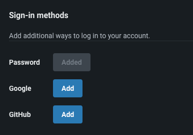 To add new methods to log in to your DataRobot account, click Add for either Google or Github SSO.