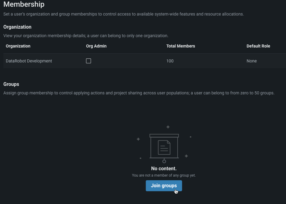 Organization and group assignments allow system administrators to manage users, control project sharing, apply actions across user populations, etc. You may be a member of up to ten groups or not a member of any groups. Likewise, you may be a member of a single organization or not a member of any organization. System administrators choose how they want to configure user membership assignments. Only they can create and modify these memberships.