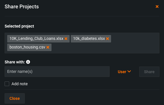 To increase collaboration, you can share assets with other DataRobot users, groups within your org, and with the entire organization. However, note that it is required that users and groups must belong to the same organization when sharing. See tenant isolation and collaboration for details.