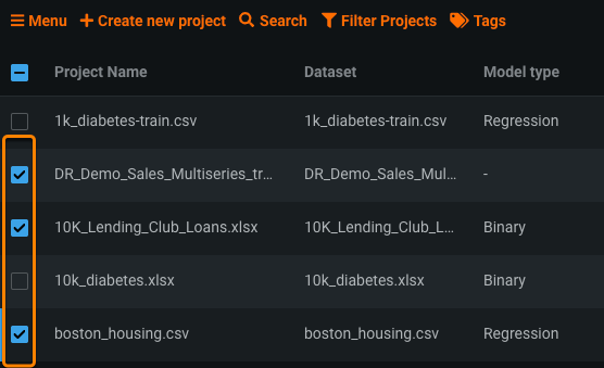 The Selected projects field is prepopulated with the projects you checked in the project listing. To include additional projects, begin typing the name and DataRobot will string match your entry. Click to add.
