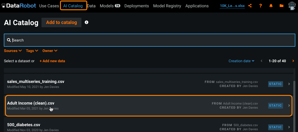 Navigate to the AI Catalog (top menu) and select the dataset to share.