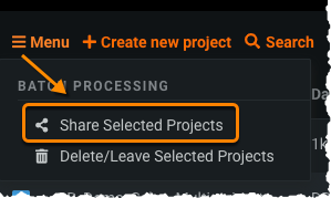 From the Menu, click Share Selected Projects. (You can also click Menu > Share Multiple Projects without first selecting projects and instead enter all project names manually.) You must use this menu, not the menu to the right of the project name, to share multiple projects.