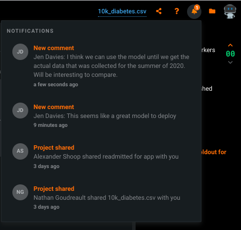 | Project shared | Reports that a project has been shared with you. DataRobot also delivers an email notification with a link to the project. |