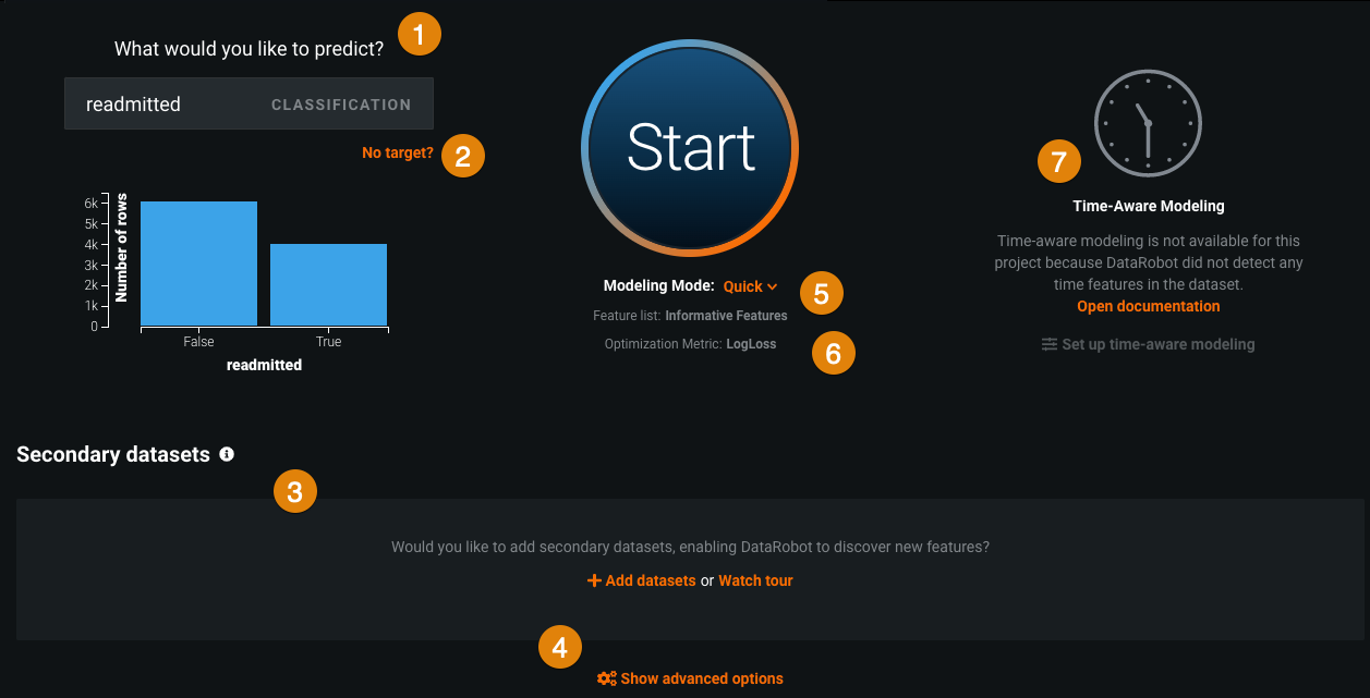 | 3 | Secondary datasets | (Optional) Add a secondary dataset by clicking + Add datasets. DateRobot performs Feature Discovery and creates relationships to the datasets. |