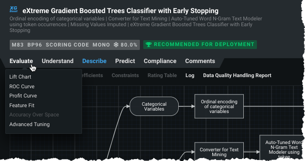 On the Leaderboard, click a model to display the model blueprint and access the many tabs available for investigating model information and insights.