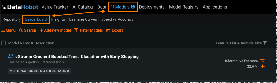 DataRobot AutoML automatically generates models and displays them on the Leaderboard. The model recommended for deployment appears at the top of the page. You can register this (or any other) model from the Leaderboard. Once the model is registered, you can create a deployment to start making and monitoring predictions.