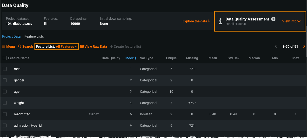 Scroll down to see the list of available features. (Optional) Select a Feature List to be used for model training. Click View info in the Data Quality Assessment area on the right to investigate the quality of features.