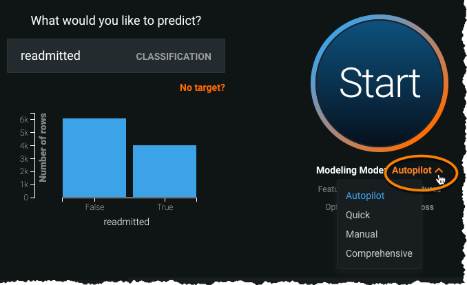 After specifying the target feature, you can select a Modeling Mode to instruct DataRobot to build more or fewer models and click Start to begin modeling: