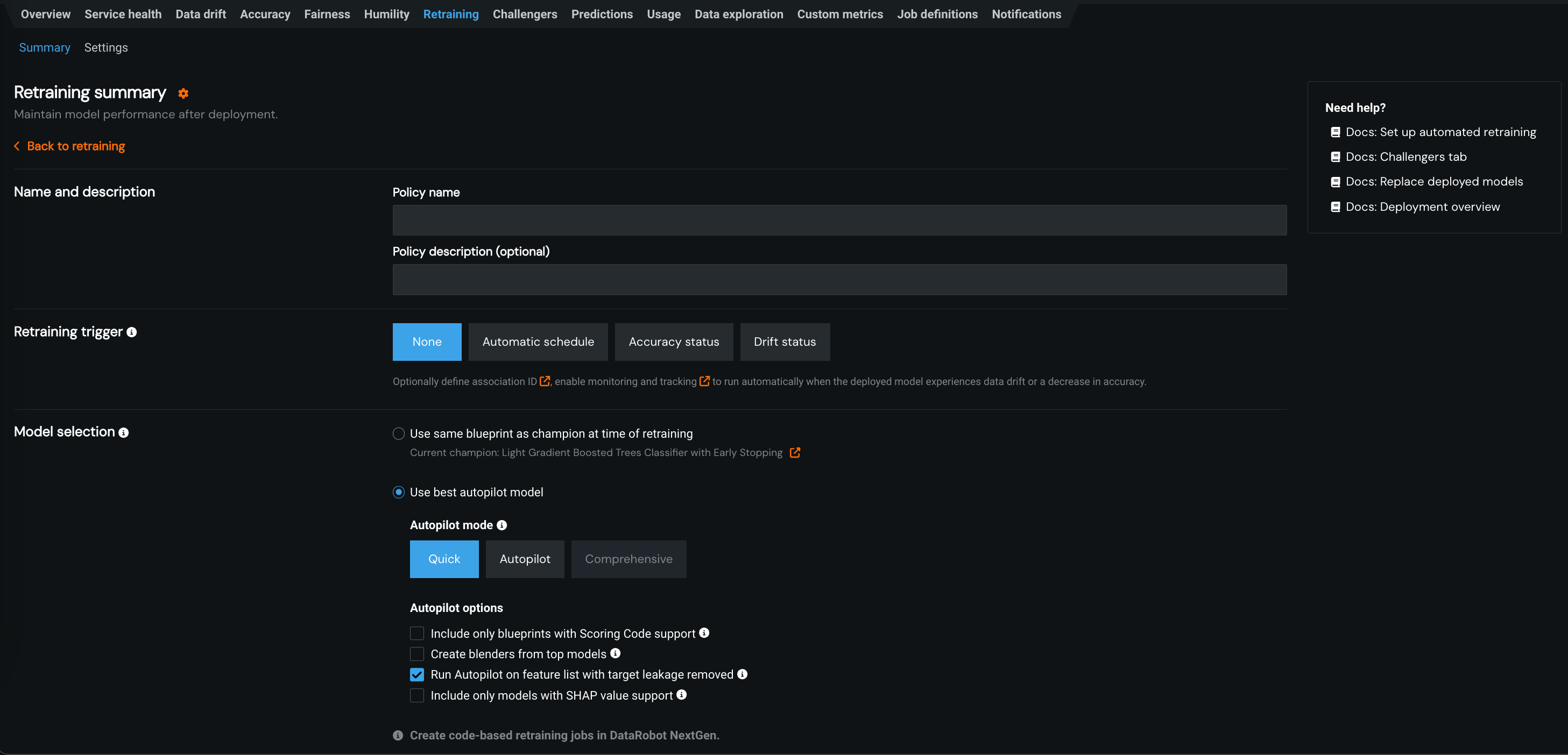 To maintain model performance after deployment without extensive manual work, DataRobot provides an automatic retraining capability for deployments. Upon providing a retraining dataset registered in the AI Catalog, you can define up to five retraining policies on each deployment, each consisting of a trigger, a modeling strategy, modeling settings, and a replacement action. When triggered, retraining will produce a new model based on these settings and notify you to consider promoting it. If necessary, you can manually replace a deployed model.