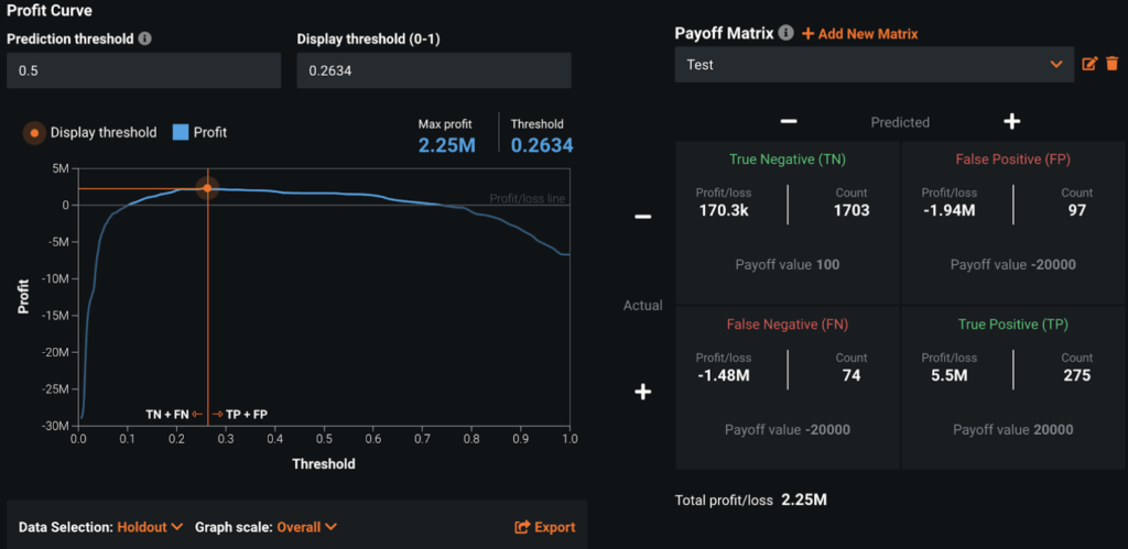 DataRobot then automatically calculates the threshold that maximizes profit. You can also measure DataRobot ROI by creating the same payoff matrix for your existing business process and subtracting the max profit of the existing process from that calculated by DataRobot.