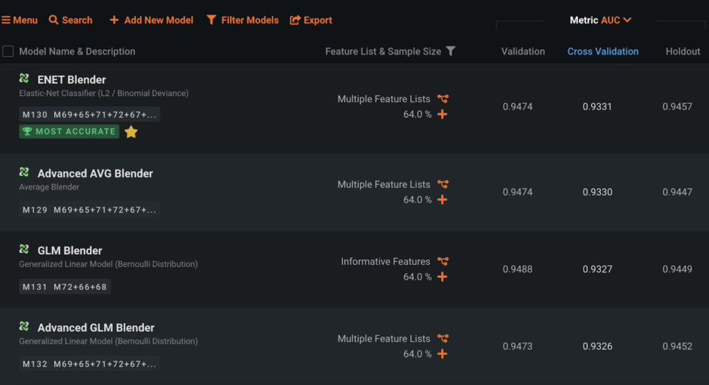 Modeling results show that the ENET Blender is the most accurate model, with 0.93 AUC on cross validation. This is an ensemble of eight single models. The high accuracy indicates that the model has learned signals to distinguish fraudulent from non-fraudulent claims. Keep in mind, however, that blenders take longer to score compared to single models and so may not be ideal for real-time scoring.