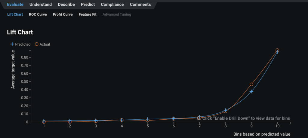 The steep increase in the average target value in the right side of the Lift Chart reveals that, when the model predicts that a claim has a high probability of being fraudulent (blue line), the claim tends to actually be fraudulent (orange line).