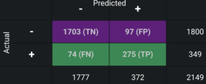 - Of 1,777 claims predicted as non-fraud, 1,703 were actually not fraudulent (true negatives) and 74 were fraudulent (false negatives).
