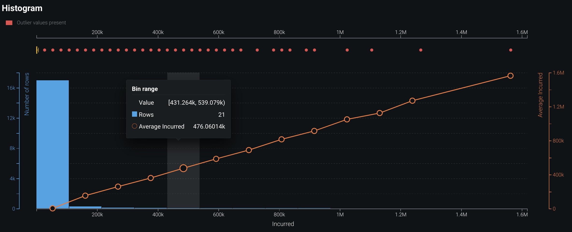 DataRobot automatically performs data quality checks. In this example, it has detected outliers for the target feature. Click Show Outliers to view them all (outliers are common in insurance claims data). To avoid bias introduced by the outlier, a common practice is to cap the target, such as capping it to the 95th percentile. This cap is especially important for linear models.