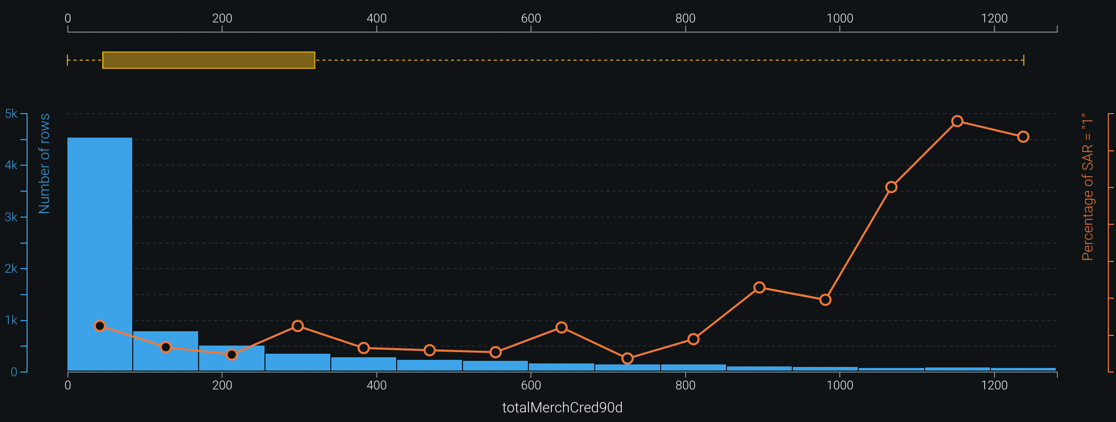To understand the direction of impact and the SAR risk at different levels of the input feature, DataRobot provides partial dependence graphs (within the Feature Effects tab) to depict how the likelihood of being a SAR changes when the input feature takes different values. In this example, the total merchant credit amount in the last 90 days is the most impactful feature, but the SAR risk is not linearly increasing when the amount increases.