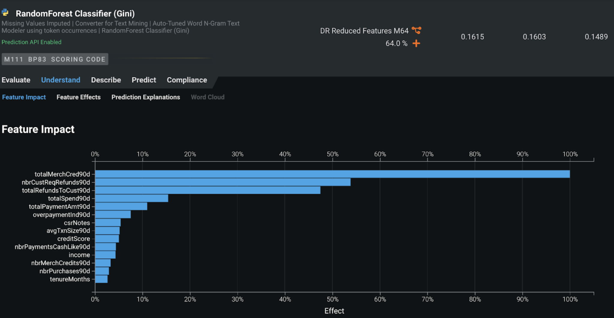 Feature Impact reveals the association between each feature and the target. DataRobot identifies the top three most impactful features (which enable the machine to differentiate SAR from non-SAR alerts) as total merchant credit in the last 90 days, number refund requests by the customer in the last 90 days, and total refund amount in the last 90 days.