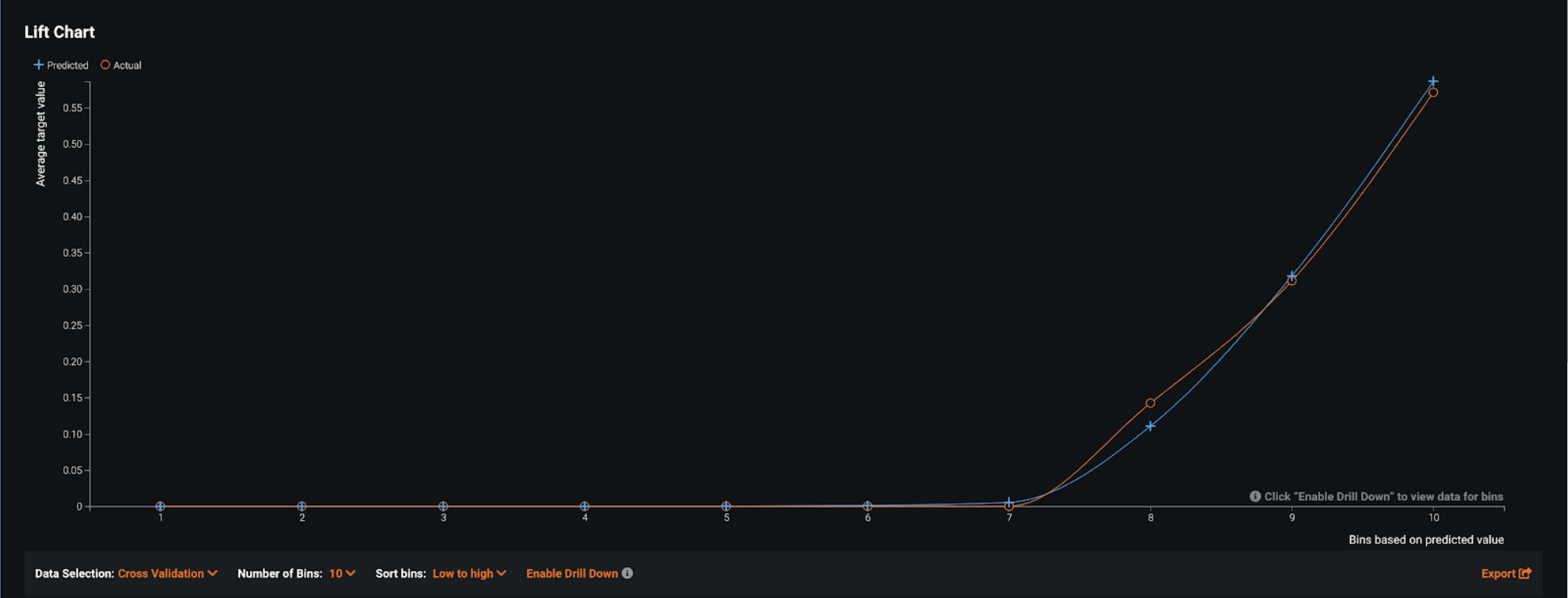 The Lift Chart shows how effective the model is at separating the SAR and non-SAR alerts. After an alert in the out-of-sample partition gets scored by the model, it is assigned a risk score that measures the likelihood of the alert being a SAR risk or becoming a SAR. In the Lift Chart, alerts are sorted based on the SAR risk, broken down into 10 deciles, and displayed from lowest to the highest. For each decile, DataRobot computes the average predicted SAR risk (blue plus) as well as the average actual SAR event (orange circle) and depicts the two lines together. For the champion model built for this false positive reduction use case, the SAR rate of the top decile is 55%, which is a significant lift from the ~10% SAR rate in the training data. The top three deciles capture almost all SARs, which means that the 70% of alerts with very low predicted SAR risk rarely result in SAR.