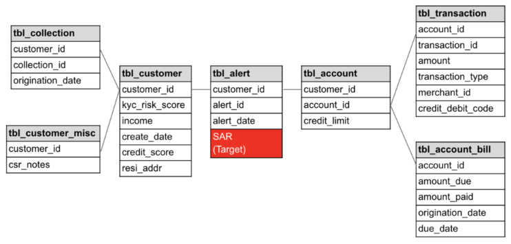 The target variable for this use case is whether or not the alert resulted in a SAR after manual review by investigators, making this a binary classification problem. The unit of analysis is an individual alert—the model will be built on the alert level—and each alert will receive a score ranging from 0 to 1. The score indicates the probability of being a SAR.
