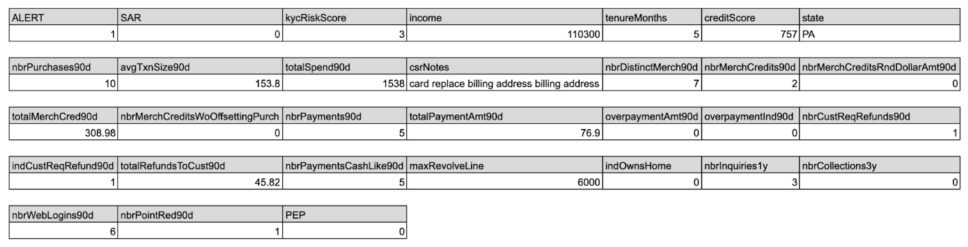 The features in the sample dataset consist of KYC (Know-Your-Customer) information, demographic information, transactional behavior, and free-form text information from notes taken by customer service representatives. To apply this use case in your organization, your dataset should contain, at a minimum, the following features:
